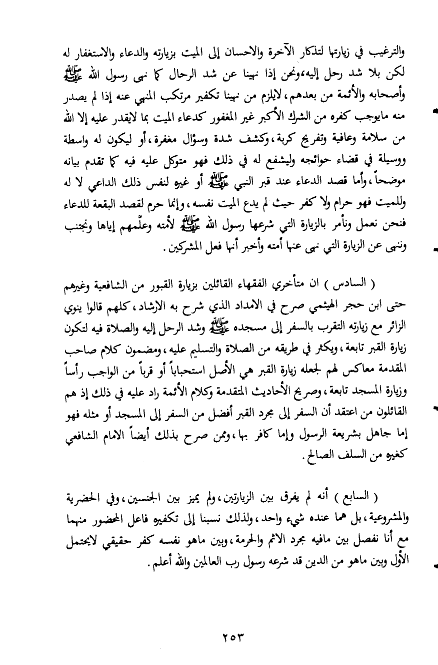 (السادس) ان متأخري الفقهاء القائلين بزيارة القبور من الشافعية وغيرهم حتى ابن حجر الهيثمي صرح في الإمداد الذي شرح به الإرشاد، كلهم قالوا ينوي الزائر مع زيارته التقرب بالسفر إلى مسجده صلى الله عليه وسلم وشد الرحل إليه والصلاة فيه لتكون زيارة القبر تابعة، ويكثر في طريقه من الصلاة والتسليم عليه، ومضمون كلام صاحب المقدمة معاكس لهم لجعله زيارة القبر هي الأصل استحباباً أو قرباً من الواجب رأساً وزيارة المسجد تابعة، وصريح الأحاديث المتقدمة وكلام الأئمة راد عليه في ذلك إذ هم القائلون من اعتقد أن السفر إلى مجرد القبر أفضل من السفر إلى المسجد أو مثله فهو إما جاهل بشريعة الرسول وإما كافر بها، وممن صرح بذلك أيضاً الإمام الشافعي كغيره من السلف الصالح.