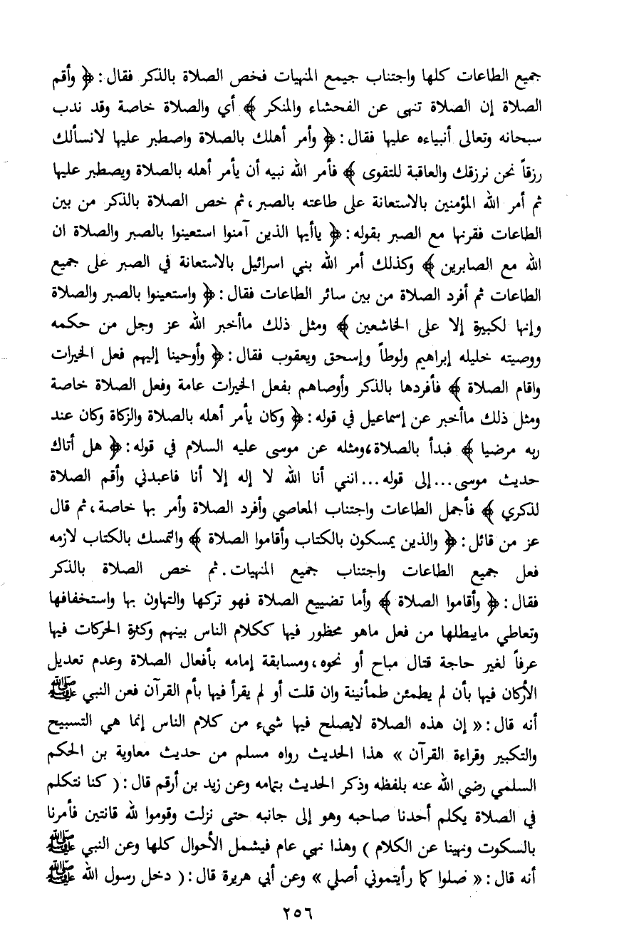 جميع الطاعات كلها واجتناب جميع المنهيات فخص الصلاة بالذكر فقال: {وَأَقِمِ الصَّلاةَ إِنَّ الصَّلاةَ تَنْهَى عَنِ الْفَحْشَاءِ وَالْمُنْكَرِ} أي والصلاة خاصة وقد ندب سبحانه وتعالى أنبياءه عليها فقال: {وَأْمُرْ أَهْلَكَ بِالصَّلاةِ وَاصْطَبِرْ عَلَيْهَا لا نَسْأَلُكَ رِزْقاً نَحْنُ نَرْزُقُكَ وَالْعَاقِبَةُ لِلتَّقْوَى} فأمر الله نبيه أن يأمر أهله بالصلاة ويصطبر عليها ثم أمر الله المؤمنين بالاستعانة على طاعته بالصبر، ثم خص الصلاة بالذكر من بين الطاعات فقرنها مع الصبر بقوله: {يَا أَيُّهَا الَّذِينَ آمَنُوا اسْتَعِينُوا بِالصَّبْرِ وَالصَّلاةِ إِنَّ اللَّهَ مَعَ الصَّابِرِينَ} وكذلك أمر الله بني إسرائيل بالاستعانة في الصبر على جميع الطاعات ثم أفرد الصلاة من بين سائر الطاعات فقال: {وَاسْتَعِينُوا بِالصَّبْرِ وَالصَّلاةِ وَإِنَّهَا لَكَبِيرَةٌ إِلَّا عَلَى الْخَاشِعِينَ} ومثل ذلك ما أخبر الله عز وجل من حكمه ووصيته خليله إبراهيم ولوطاً وإسحق ويعقوب فقال: {وَأَوْحَيْنَا إِلَيْهِمْ فِعْلَ الْخَيْرَاتِ وَإِقَامَ الصَّلاة} فأفردها بالذكر وأوصاهم بفعل الخيرات عامة وفعل الصلاة خاصة ومثل ذلك ما أخبر عن إسماعيل في قوله: {وَكَانَ يَأْمُرُ أَهْلَهُ بِالصَّلاةِ وَالزَّكَاةِ وَكَانَ عِنْدَ رَبِّهِ مَرْضِيّاً} فبدأ بالصلاة، ومثله عن موسى عليه السلام في قوله: {وَهَلْ أَتَاكَ حَدِيثُ مُوسَى * إِنَّنِي أَنَا اللَّهُ لا إِلَهَ إِلاَّ أَنَا فَاعْبُدْنِي وَأَقِمِ الصَّلاةَ لِذِكْرِي} فأجمل الطاعات واجتناب المعاصي وأفرد الصلاة وأمر بها خاصة، ثم قال عز من قائل: {وَالَّذِينَ يُمَسِّكُونَ بِالْكِتَابِ وَأَقَامُوا الصَّلاةَ} والتمسك بالكتاب لازمه فعل جميع الطاعات واجتناب جميع المنهيات. ثم خص الصلاة بالذكر فقال: {وَأَقَامُوا الصَّلاةَ} وأما تضييع الصلاة فهو تركها والتهاون بها واستخفافها وتعاطي ما يبطلها من فعل ما هو محظور فيها ككلام الناس بينهم وكثرة الحركات فيها عرفاً لغير حاجة قتال مباح أو نحوه، ومسابقة إمامه بأفعال الصلاة وعدم تعديل الأركان فيها بأن لم يطمئن طمأنينة وان قلت أو لم يقرأ فيها بأم القرآن فعن النبي صلى الله عليه وسلم أنه قال: " إن هذه الصلاة لا يصلح فيها شيء من كلام الناس إنما هي التسبيح والتكبير وقراءة القرآن" هذا الحديث رواه مسلم من حديث معاوية بن الحكم السلمي رضي الله عنه بلفظه وذكر الحديث بتمامه وعن زيد بن أرقم قال: "كنا نتكلم في الصلاة يكلم أحدنا صاحبه وهو إلى جانبه حتى نزلت وقوموا لله قانتين فأمرنا بالسكوت ونهينا عن الكلام" وهذا نهى عام فيشمل الأحوال كلها وعن النبي صلى الله عليه وسلم أنه قال: "صلوا كما رأيتموني أصلي" وعن أبي هريرة قال: "دخل رسول الله صلى الله عليه وسلم
