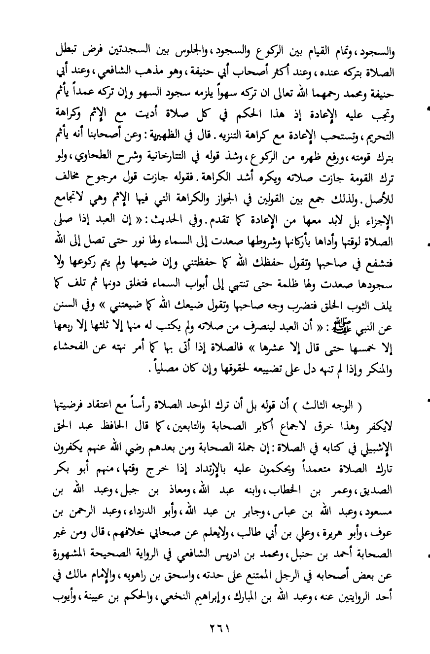 (الوجه الثالث) أن قوله بل أن ترك الموحد الصلاة رأساً مع اعتقاد فرضيتها لا يكفر وهذا خرق لاجماع أكابر بر الصحابة والتابعين، كما قال الحافظ عبد الحق الاشبيلي في كتابه في الصلاة: إن جملة الصحابة ومن بعدهم رضي الله عنهم يكفرون تارك الصلاة متعمداً ويحكمون عليه بالارتداد إذا خرج وقتها، منهم أبو بكر الصديق، وعمر بن الخطاب، وابنه عبد الله، ومعاذ بن جبل، وعبد الله بن مسعود، وعبد الله بن عباس، وجابر بن عبد الله، وأبو الدرداء، وعبد الرحمن بن عوف، وأبو هريرة، وعلي بن أبي طالب، ولا يعلم عن صحابي خلافهم، قال ومن غير الصحابة أحمد بن حنبل، ومحمد بن إدريس الشافعي في الرواية الصحيحة المشهورة عن بعض أصحابه في الرجل الممتنع على حدته، واسحق بن راهويه، والإمام مالك في أحد الروايتين عنه، وعبد الله بن المبارك، وإبراهيم النخعي، والحكم بن عتبية، وأيوب
