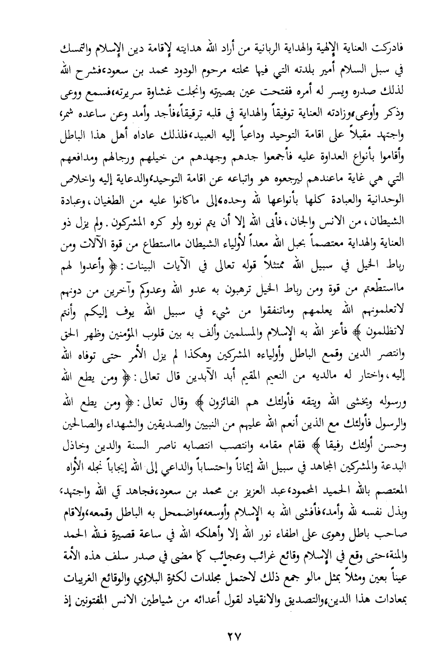 فأدركت العناية الإلهية والهداية الربانية من أراد الله هدايته لإقامة دين الإسلام والتمسك في سبل السلام أمير بلدته التي فيها محلته مرحوم الودود محمد بن سعود، فشرح الله لذلك صدره ويسر له أمره ففتحت عين بصيرته وانجلت غشاوة سريرته، فسمع ووعى وذكر وأوعى، وزادته العناية توفيقاً والهداية في قلبه ترقيقاً، فأجد وأمد وعن ساعده شمر، واجتهد مقبلاً على إقامة التوحيد وداعياً إليه العبيد، فلذلك عاداه أهل هذا الباطل وأقاموا بأنواع العداوة عليه فأجمعوا جدهم وجهدهم من خيلهم ورجالهم ومدافعهم التي هي غاية ما عندهم ليرجعوه هو واتباعه عن إقامة التوحيد، والدعاية إليه وإخلاص الوحدانية والعبادة كلها بأنواعها لله وحده، إلى ما كانوا عليه من الطغيان، وعبادة الشيطان، من الإنس والجان، فأبى الله إلا أن يتم نوره ولو كره المشركون. ولم يزل ذو العناية الهداية معتصماً بحبل الله معداً لأولياء الشيطان ما استطاع من قوة الآلات ومن رباط الخيل في سبيل الله تمثلاً قوله تعالى في الآيات البينات: {وَأَعِدُّوا لَهُمْ مَا اسْتَطَعْتُمْ مِنْ قُوَّةٍ وَمِنْ رِبَاطِ الْخَيْلِ تُرْهِبُونَ بِهِ عَدُوَّ اللَّهِ وَعَدُوَّكُمْ وَآخَرِينَ مِنْ دُونِهِمْ لا تَعْلَمُونَهُمُ اللَّهُ يَعْلَمُهُمْ وَمَا تُنْفِقُوا مِنْ شَيْءٍ فِي سَبِيلِ اللَّهِ يُوَفَّ إِلَيْكُمْ وَأَنْتُمْ لا تُظْلَمُونَ} فأعز الله به الإسلام والمسلمين وألف به بين قلوب المؤمنين وظهر الحق وانتصر الدين وقمع الباطل وأولياءه المشركين وهكذا لم يزل الأمر حتى توفاه الله إليه، وأختار له ما لديه من النعيم المقر أبد الآبدين قال تعالى: {وَمَنْ يُطِعِ اللَّهَ وَرَسُولَهُ وَيَخْشَ اللَّهَ وَيَتَّقْهِ فَأُولَئِكَ هُمُ الْفَائِزُونَ} وقال تعالى: {وَمَنْ يُطِعِ اللَّهَ وَالرَّسُولَ فَأُولَئِكَ مَعَ الَّذِينَ أَنْعَمَ اللَّهُ عَلَيْهِمْ مِنَ النَّبِيِّينَ وَالصِّدِّيقِينَ وَالشُّهَدَاءِ وَالصَّالِحِينَ وَحَسُنَ أُولَئِكَ رَفِيقاً} فقام مقامه وانتصب انتصابه ناصر السنة والدين وخاذل البدعة والمشركين المجاهد في سبيل الله إيماناً واحتساباً والداعي إلى الله إيجاباً نجله الأواه المعتصم بالله الحميد المحمود، عبد العزيز بن محمد بن سعود، فجاهد في الله واجتهد، وبذل نفسه لله وأمد، فأفشى الله به الإسلام وأوسعه، واضمحل به الباطل وقمعه، ولا قام صاحب باطل وهوى على إطفاء نور الله إلا وأهلكه الله في ساعة قصيرة فلله الحمد والمنة، حتى وقع في الإسلام وقائع غرائب وعجائب كما مضى في صدر سلف هذه الأمة عيناً بعين ومثلاً بمثل ما لو جمع ذلك لاحتمل مجلدات لكثرة البلاوي والوقائع الغريبات بمعادات هذا الدين، والتصديق والانقياد لقول أعدائه من شياطين الإنس المفتونين إذ