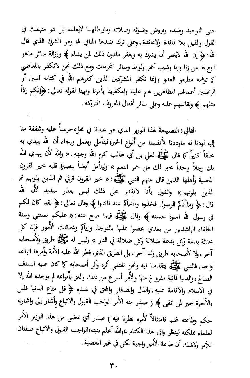 الثاني: النصيحة لهذا الوزير الذي هو عندنا في محل، حرصاً عليه وشفقة منا إليه لودنا له ما وددنا لأنفسنا من أنواع الخير، فيتأمل ويعمل ورجاء أن الله يهدي به خلقاً كثيراً كما قال صلى الله عليه وسلم لعلي بن أبي طالب كرم الله وجهه: "والله لأن يهدي الله بك رجلاً واحداً خير لك من حمر النعم" وليتأمل أيضاً ببصيرة قلبه خير القرون الماضية وأهلها الذين قال عنهم النبي صلى الله عليه وسلم: "خير القرون قرني ثم الذين يلونهم ثم الذين يلونهم" والقول بأنا لا نقدر على ذلك ليس بعذر سديد لأن الله قال: {وَمَا آتَاكُمُ الرَّسُولُ فَخُذُوهُ وَمَا نَهَاكُمْ عَنْهُ فَانْتَهُوا} وقال تعالى: {لَقَدْ كَانَ لَكُمْ فِي رَسُولِ اللَّهِ أُسْوَةٌ حَسَنَةٌ} وقال صلى الله عليه وسلم فيما صح عنه: "عليكم بسنتي وسنة الخلفاء الراشدين من بعدي عضوا عليها بالنواجذ وإياكم ومحدثات الأمور فإن كل محدثة بدعة وكل بدعة ضلالة وكل ضلالة في النار" وليس له صلى الله عليه وسلم طريق ولأصحابه آخر، ولا لأصحابه طريق ولنا آخر، بل الطريق الذي فطر الله عليه الأمة وأمرها إتباعه واحد، فالنبي صلى الله عليه وسلم يتقدمنا فيه ونحن نقتفي أثره وأثر أصحابه كما كان عليه السلف الصالح، والدنيا فانية مفروغ منها والأمر أسرع من ذلك والعز بأنواعه لم يوجده الله إلا في الإسلام والإقامة عليه، والذل والصغار والمحق في ضده {قُلْ مَتَاعُ الدُّنْيَا قَلِيلٌ وَالْآخِرَةُ خَيْرٌ لِمَنِ اتَّقَى} (صدر منه الأمر الواجب القبول والإتباع وأشار إلى وإشارته حكم وطاعته غنم فامتثالاً لأمره نظرنا فيه) صدر أي مضى من هذا الوزير الأمر لعلماء مملكته لينظروا في هذا الكتاب، والله أعلم بنيته، الواجب القبول والإتباع صفتان للأمر ولا شك أن طاعة الأمير واجبة لكن في غير المعصية.