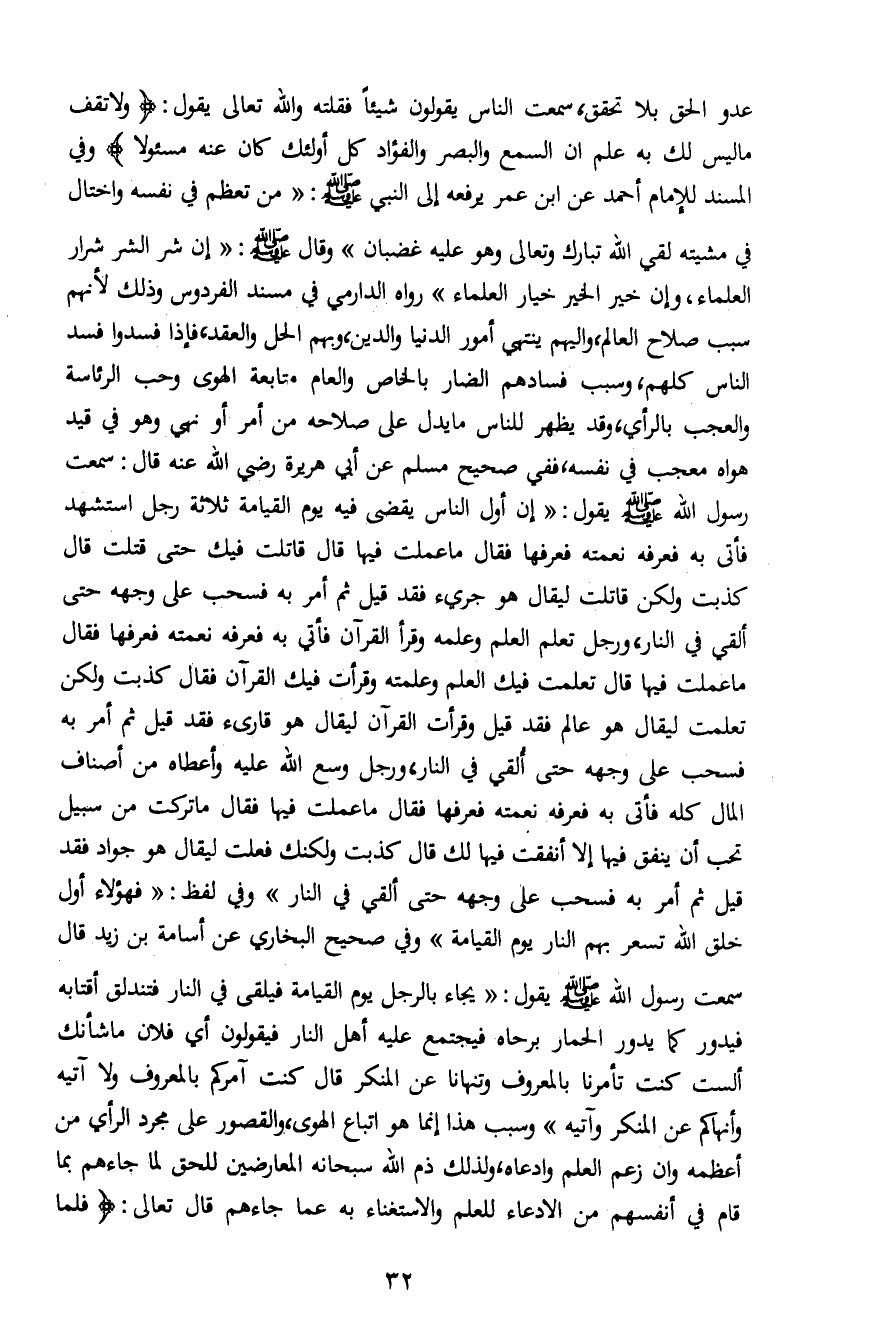 عدو الحق بلا تحقق، سمعت الناس يقولون شيئاً فقلته والله تعالى يقول: {وَلا تَقْفُ مَا لَيْسَ لَكَ بِهِ عِلْمٌ إِنَّ السَّمْعَ وَالْبَصَرَ وَالْفُؤَادَ كُلُّ أُولَئِكَ كَانَ عَنْهُ مَسْؤُولاً} وفي المسند للإمام أحمد عن ابن عمر يرفعه إلى النبي صلى الله عليه وسلم: "من تعظم في نفسه واختال في مشيته لقي الله تبارك وتعالى وهو عليه غضبان" وقال صلى الله عليه وسلم: "إن شر الشر شرار العلماء، وإن خير الخير خيار العلماء" رواه الديلمي في مسند الفردوس وذلك لأنهم سبب صلاح العالم، واليهم ينتهي أمور الدنيا والدين، وبهم الحل والعقد، فإذا فسدوا فسد الناس كلهم، وسبب فسادهم الضار بالخاص والعام. متابعة الهوى وحب الرئاسة والعجب بالرأي، وقد يظهر للناس ما يدل على صلاحه من أمر أو نهي وهو في قيد هواه معجب في نفسه، ففي صحيح مسلم عن أبي هريرة رضى الله عنه قال: سمعت رسول الله صلى الله عليه وسلم يقول: "إن أول الناس يقضى فيه يوم القيامة ثلاثة رجل استشهد فأتى به فعرفه نعمته فعرفها فقال ما عملت فيها قال قاتلت فيك حتى قتلت قال كذبت ولكن قاتلت ليقال هو جريء فقد قيل ثم أمر به فسحب على وجهه حتى ألقي في النار، ورجل تعلم العلم وعلمه وقرأ القرآن فأتي به فعرفه نعمته فعرفها فقال ما عملت فيها قال تعلمت فيك العلم وعلمته وقرأت فيك القرآن فقال كذبت ولكن تعلمت ليقال هو عالم فقد قيل وقرأت القرآن ليقال هو قارئ فقد قيل ثم أمر به فسحب على وجهه حتى أُلقي في النار، ورجل وسع الله عليه وأعطاه من أصناف المال كله فأتى به فعرفه نعمته فعرفها فقال ما عملت فيها فقال ما تركت من سبيل تحب أن ينفق فيها إلا أنفقت فيها لك قال كذبت ولكنك فعلت ليقال هو جواد فقد قيل ثم أمر به فسحب على وجهه حتى ألقي في النار" وفي لفظ: " فهؤلاء أول خلق الله تسعر بهم النار يوم القيامة" وفي صحيح البخاري عن أسامة بن زيد قال سمعت رسول الله صلى الله عليه وسلم يقول: "يجاء بالرجل يوم القيامة فيلقى في النار فتندلق أقتابه فيدور كما يدور الحمار برحاه فيجتمع عليه أهل النار فيقولون أي فلان ما شأنك ألست كنت تأمرنا بالمعروف وتنهانا عن المنكر قال كنت آمركم بالمعروف ولا آتيه وأنهاكم عن المنكر وآتيه" وسبب هذا إنما هو إتباع الهوى، والقصور على مجرد الرأي من أعظمه وان زعم العلم وادعاه، ولذلك ذم الله سبحانه المعارضين للحق لما جاءهم بما
