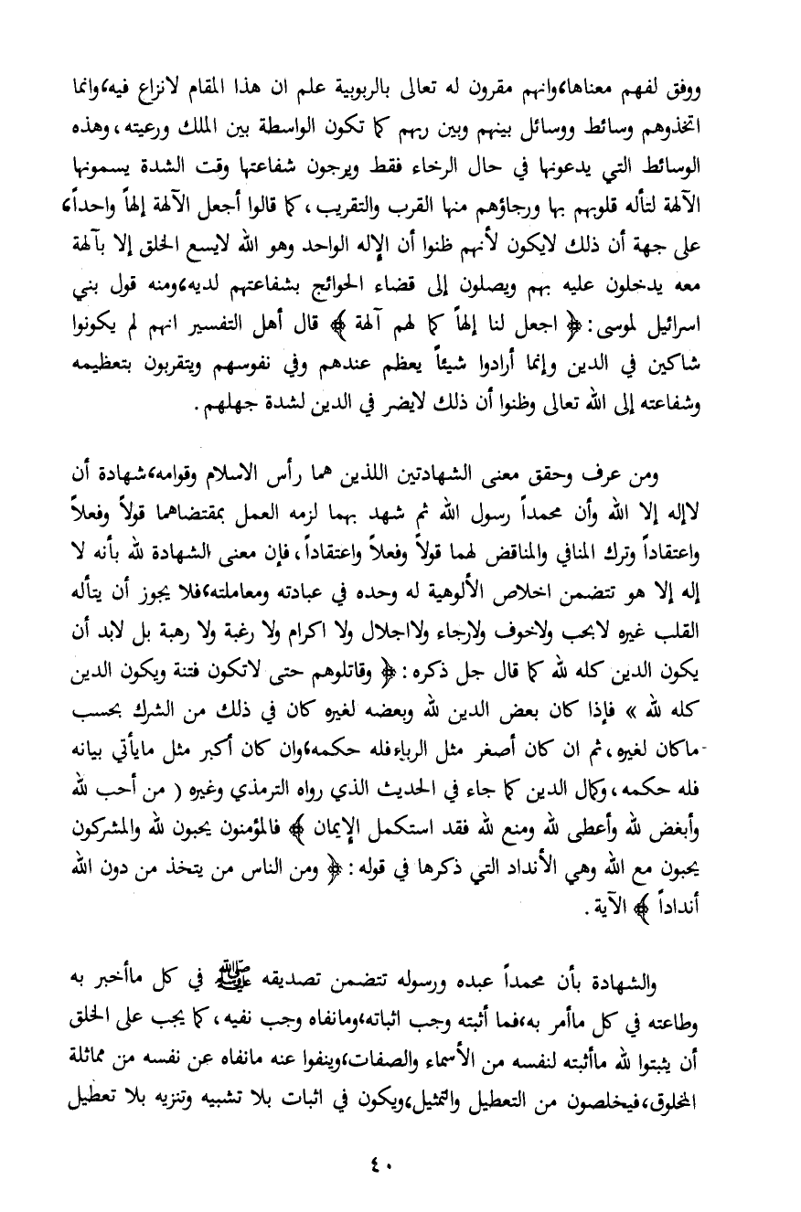 ومن عرف وحقق معنى الشهادتين اللذين هما رأس الإسلام وقوامه، شهادة أن لا إله إلا الله وأن محمداً رسول الله ثم شهد بهما لزمه العمل بمقتضاهما قولاً وفعلاً واعتقاداً وترك المنافي والمناقض لهما قولاً وفعلاً واعتقاداً، فإن معنى الشهادة لله بأنه لا إله إلا هو تتضمن إخلاص الألوهية له وحده في عبادته ومعاملته، فلا يجوز أن يتأله القلب غيره لا بحب ولا خوف ولا رجاء ولا إجلال ولا إكرام ولا رغبة ولا رهبة بل لا بد أن يكون الدين كله لله كما قال جل ذكره: {وَقَاتِلُوهُمْ حَتَّى لا تَكُونَ فِتْنَةٌ وَيَكُونَ الدِّينُ كُلُّهُ لِلَّهِ} فإذا كان بعض الدين لله وبعضه لغيره كان في ذلك من الشرك بحسب ما كان لغيره، ثم إن كان أصغر مثل الرياء فله حكمه، وان كان أكبر مثل ما يأتي بيانه فله حكمه، وكمال الدين كما جاء في الحديث الذي رواه الترمذي وغيره "من أحب لله وأبغض لله وأعطى لله ومنع لله فقد استكمل الإيمان" فالمؤمنون يحبون لله والمشركون يحبون مع الله وهي الأنداد التي ذكرها في قوله: {وَمِنَ النَّاسِ مَنْ يَتَّخِذُ مِنْ دُونِ اللَّهِ أَنْدَاداً} الآية.