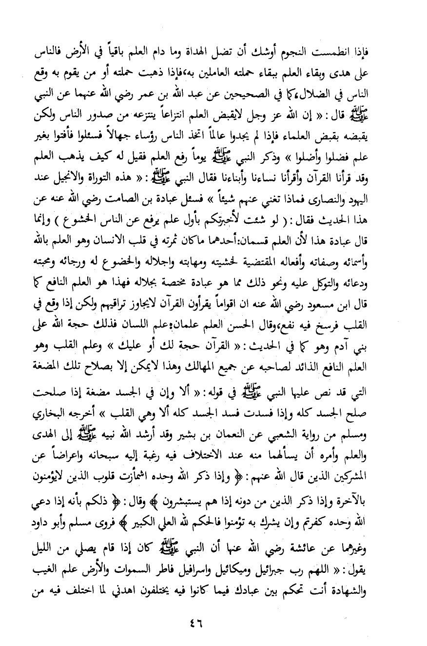 فإذا انطمست النجوم أوشك أن تضل الهداة وما دام العلم باقياً في الأرض فالناس على هدى وبقاء العلم ببقاء حملته العاملين به، فإذا ذهبت حملته أو من يقوم به وقع الناس في الضلال، كما في الصحيحين عن عبد الله بن عمرو رضي الله عنهما عن النبي صلى الله عليه وسلم قال: "إن الله عز وجل لا يقبض العلم انتزاعاً ينتزعه من صدور الناس ولكن يقبضه بقبض العلماء فإذا لم يجدوا عالماً اتخذ الناس رؤساء جهالاً فسئلوا فأفتوا بغير علم فضلوا وأضلوا" وذكر النبي صلى الله عليه وسلم يوماً رفع العلم فقيل له كيف يذب العلم وقد قرأنا القرآن وأقرأنا نساءنا وأبناءنا فقال النبي صلى الله عليه وسلم: "هذه التوراة والإنجيل عند اليهود والنصارى فماذا تغني عنهم شيئاً" فسئل عبادة بن الصامت رضى الله عنه عن هذا الحديث فقال: "لو شئت لأخبرتكم بأول علم يرفع عن الناس الخشوع" وإنما قال عبادة هذا لأن العلم قسمان: أحدهما ما كان ثمرته في قلب الإنسان وهو العلم بالله وأسمائه وصفاته وأفعاله المقتضية لخشيته ومهابته وإجلاله والخضوع له ورجائه ومحبته ودعائه والتوكل عليه ونحو ذلك مما هو عبادة مختصة بجلاله فهذا هو العلم النافع كما قال ابن مسعود رضي الله عنه أن أقواماً يقرأون القرآن لا يجاوز تراقيهم ولكن إذا وقع في القلب فرسخ فيه نفع، وقال الحسن العلم علمان: علم اللسان فذلك حجة الله على بني آدم وهو كما في الحديث: "القرآن حجة لك أو عليك" وعلم القلب وهو العلم النافع الذائد لصاحبه عن جميع المهالك وهذا لا يمكن إلا بصلاح تلك المضغة التي قد نص عليها النبي صلى الله عليه وسلم في قوله: " ألا وإن في الجسد مضغة إذا صلحت صلح الجسد كله وإذا فسدت فسد الجسد كله ألا وهي القلب" أخرجه البخاري ومسلم من رواية الشعبي عن النعمان بن بشير وقد أرشد الله نبيه صلى الله عليه وسلم إلى الهدى والعلم وأمره أن يسألهما منه عند الاختلاف فيه رغبة إليه سبحانه وإعراضاً عن المشركين الذين قال الله عنهم: {وَإِذَا ذُكِرَ اللَّهُ وَحْدَهُ اشْمَأَزَّتْ قُلُوبُ الَّذِينَ لا يُؤْمِنُونَ بِالْآخِرَةِ وَإِذَا ذُكِرَ الَّذِينَ مِنْ دُونِهِ إِذَا هُمْ يَسْتَبْشِرُونَ} وقال: {ذَلِكُمْ بِأَنَّهُ إِذَا دُعِيَ اللَّهُ وَحْدَهُ كَفَرْتُمْ وَإِنْ يُشْرَكْ بِهِ تُؤْمِنُوا فَالْحُكْمُ لِلَّهِ الْعَلِيِّ الْكَبِيرِ} فروى مسلم وأبو داود وغيرهما عن عائشة رضي الله عنها أن النبي صلى الله عليه وسلم كان إذا قام يصلي من الليل يقول: " اللهم رب جبرائيل وميكائيل واسرافيل فاطر السموات والأرض علم الغيب والشهادة أنت تحكم بين عبادك فيما كانوا فيه يختلفون اهدني لما اختلف فيه من