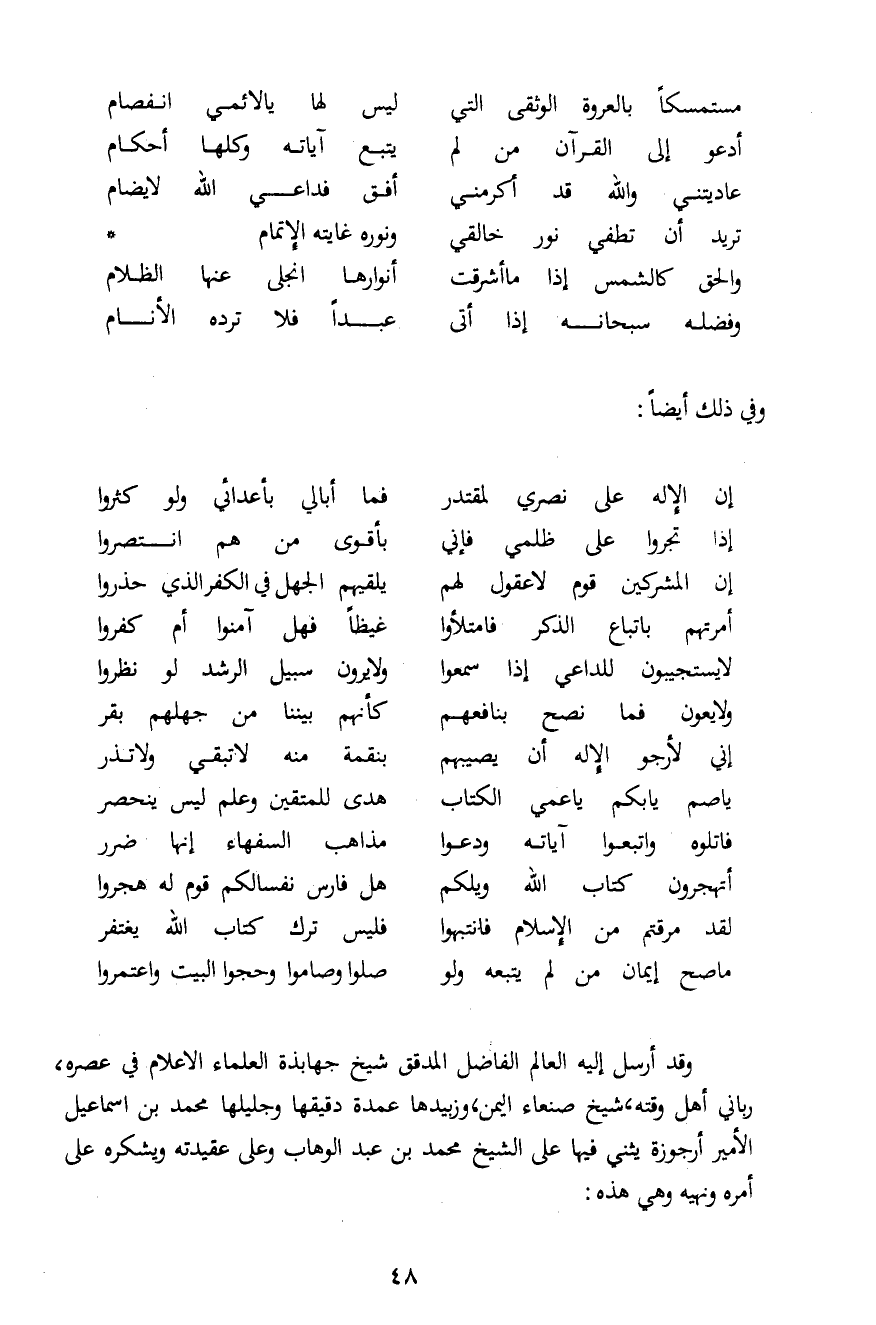 وقد أرسل إليه العالم الفاضل المدقق شيخ جهابذة العلماء الأعلام في عصره، رباني أهل وقته، شيخ صنعاء اليمن، وزبيدها عمدة دقيقها وجليلها محمد بن إسماعيل الأمير أرجوزة يثني فيها على الشيخ محمد بن عبد الوهاب وعلى عقيدته ويشكره على أمره ونهيه وهي هذه: