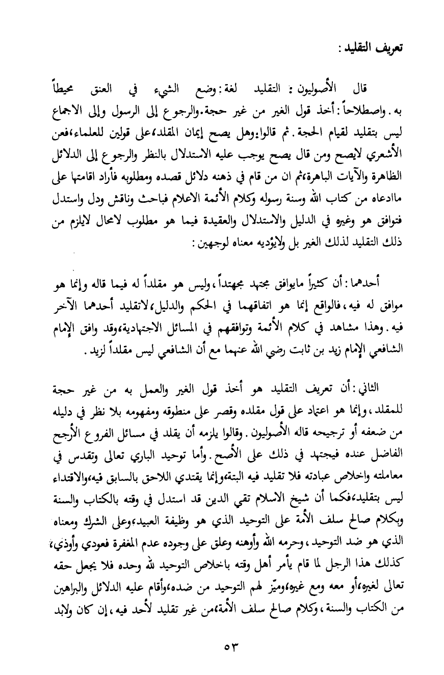 قال الأصوليون: التقليد لغة: وضع الشيء في العنق محيطاً به. واصطلاحاً: أخذ قول الغير من غير حجة. والرجوع إلى الرسول وإلى الإجماع ليس بتقليد لقيام الحجة. ثم قالوا: وهل يصح إيمان المقلد، على قولين للعلماء، فعن الأشعري لا يصح ومن قال يصح يوجب عليه الاستدلال بالنظر والرجوع إلى الدلائل الظاهرة والآيات الباهرة، ثم أن من قام في ذهنه دلائل قصده ومطلوبه فأراد إقامتها على ما ادعاه من كتاب الله وسنة رسوله وكلام الأئمة الأعلام فباحث وناقش ودل واستدل فتوافق هو وغيره في الدليل والاستدلال والعقيدة فيما هو مطلوب لا محال لا يلزم من ذلك التقليد لذلك الغير بل ولا يؤديه معناه لوجهين: