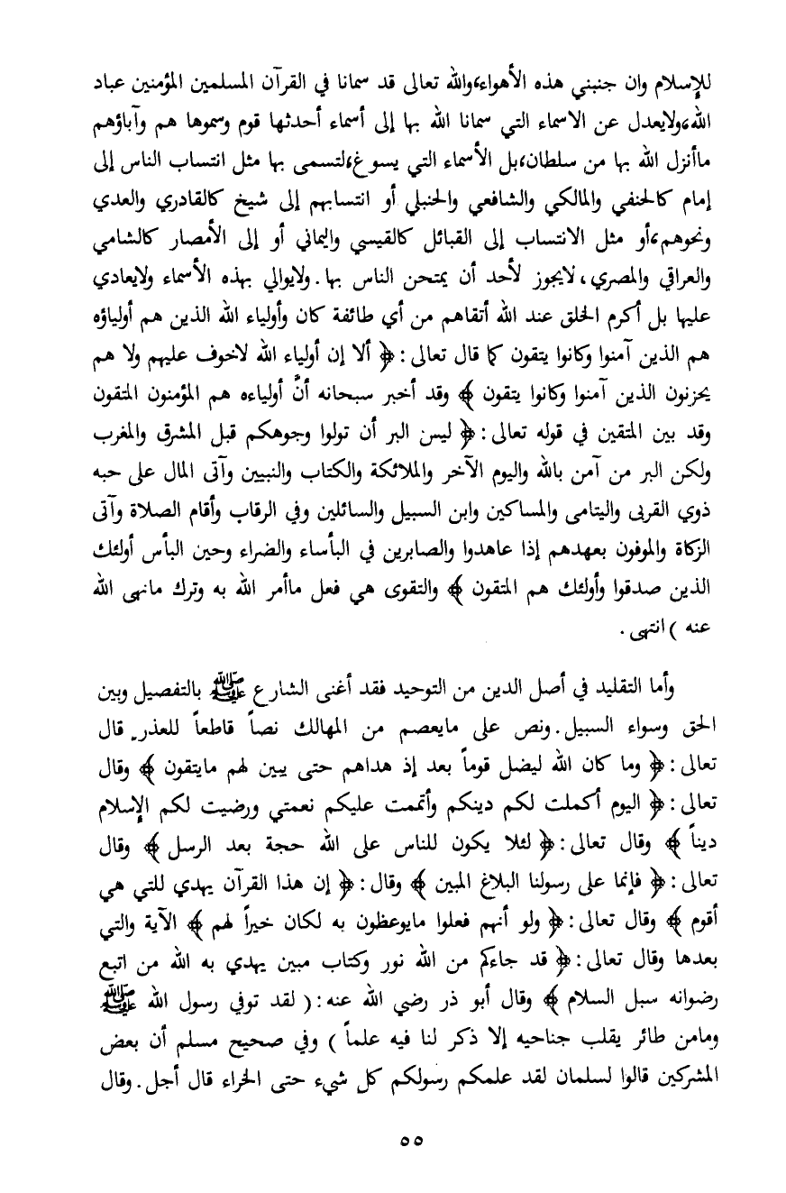 للإسلام وان جنبني هذه الأهواء، والله تعالى قد سمانا في القرآن المسلمين المؤمنين عباد الله، ولا يعدل عن الأسماء التي سمانا الله بها إلى أسماء أحدثها قوم وسموها هم وآباؤهم ما أنزل الله بها من سلطان، بل الأسماء التي يسوغ، لتسمى بها مثل انتساب الناس إلى إمام كالحنفي والمالكي والشافعي والحنبلي أو انتسابهم إلى شيخ كالقادري والعدي ونحوهم، أو مثل الانتساب إلى القبائل كالقيسي واليماني أو إلى الأمصار كالشامي والعراقي والمصري، لا يجوز لأحد أن يمتحن الناس بها. ولا يوالي بهذه الأسماء ولا يعادي عليها بل أكرم الحلق عند الله أتقاهم من أي طائفة كان وأولياء الله الذين هم أولياؤه هم الذين آمنوا وكانوا يتقون كما قال تعالى: {أَلا إِنَّ أَوْلِيَاءَ اللَّهِ لا خَوْفٌ عَلَيْهِمْ وَلا هُمْ يَحْزَنُونَ الَّذِينَ آمَنُوا وَكَانُوا يَتَّقُونَ} وقد أخبر سبحانه أن أولياءه هم المؤمنون المتقون وقد بين المتقين في قوله تعالى: {لَيْسَ الْبِرَّ أَنْ تُوَلُّوا وُجُوهَكُمْ قِبَلَ الْمَشْرِقِ وَالْمَغْرِبِ وَلَكِنَّ الْبِرَّ مَنْ آمَنَ بِاللَّهِ وَالْيَوْمِ الْآخِرِ وَالْمَلائِكَةِ وَالْكِتَابِ وَالنَّبِيِّينَ وَآتَى الْمَالَ عَلَى حُبِّهِ ذَوِي الْقُرْبَى وَالْيَتَامَى وَالْمَسَاكِينَ وَابْنَ السَّبِيلِ وَالسَّائِلِينَ وَفِي الرِّقَابِ وَأَقَامَ الصَّلاةَ وَآتَى الزَّكَاةَ وَالْمُوفُونَ بِعَهْدِهِمْ إِذَا عَاهَدُوا وَالصَّابِرِينَ فِي الْبَأْسَاءِ وَالضَّرَّاءِ وَحِينَ الْبَأْسِ أُولَئِكَ الَّذِينَ صَدَقُوا وَأُولَئِكَ هُمُ الْمُتَّقُونَ} والتقوى هي فعل ما أمر الله به وترك ما نهى الله عنه" انتهى.