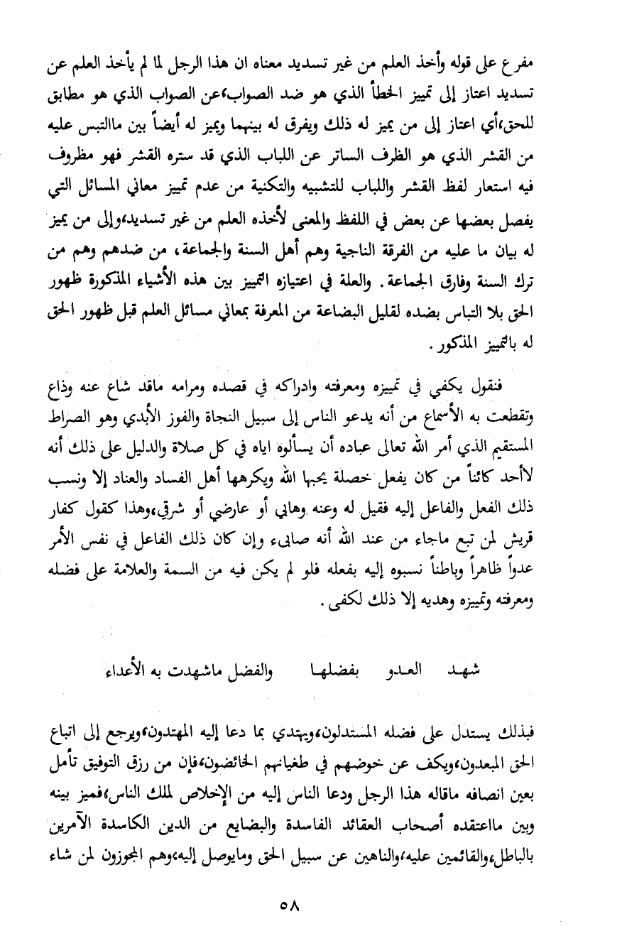 فبذلك يستدل على فضله المستدلون، ويهتدي بما دعا إليه المهتدون، ويرجع إلى إتباع الحق المبعدون، ويكف عن خوضهم في طغيانهم الخائضون، فإن من رزق التوفيق تأمل بعين انصافه ما قاله هذا الرجل ودعا الناس إليه من الإخلاص لملك الناس، فميز بينه وبين ما اعتقده أصحاب العقائد الفاسدة والبضايع من الدين الكاسدة الآمرين بالباطل، والقائمين عليه لم والناهين عن سبيل الحق وما يوصل إليه، وهم المجوزون لمن شاء
