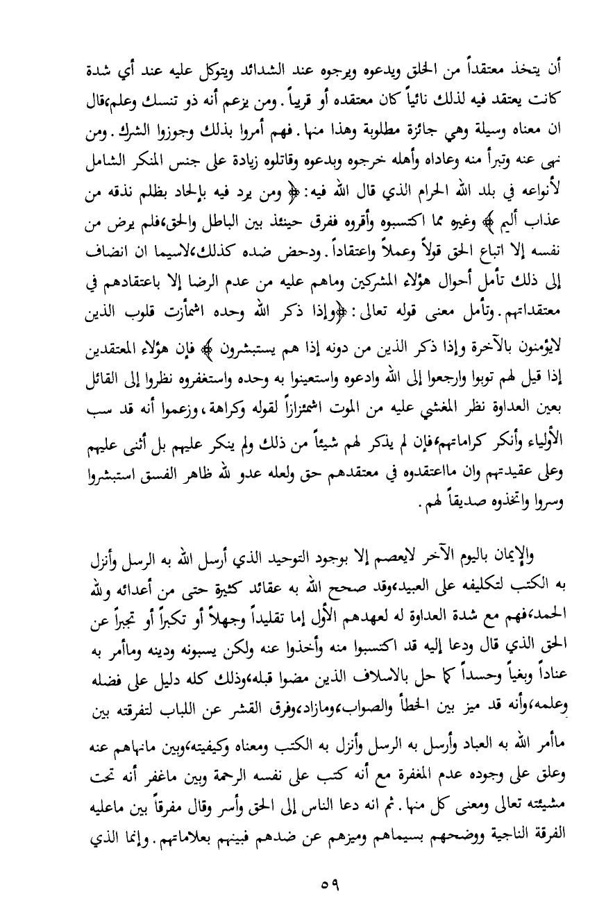 أن يتخذ معتقداً من الحلق ويدعوه ويرجوه عند الشدائد ويتوكل عليه عند أي شدة كانت يعتقد فيه لذلك نائياً كان معتقده أو قول أو ومن يزعم أنه ذو تنسك وعلم، قال ان معناه وسيلة وهي جائزة مطلوبة وهذا منها. فهم أمروا بذلك وجوزوا الشرك. ومن نهى عنه وتبرأ منه وعاداه وأهله خرجوه وبدعوه وقاتلوه زيادة على جنس المنكر الشامل لأنواعه في بلد الله الحرام الذي قال الله فيه: {وَمَنْ يُرِدْ فِيهِ بِإِلْحَادٍ بِظُلْمٍ نُذِقْهُ مِنْ عَذَابٍ أَلِيمٍ} وغيره مما اكتسبوه وأقروه ففرق حينئذ بين الباطل والحق، فلم يرض من نفسه إلا اتباع الحق قولاً وعملاً واعتقاداً. ودحض ضده كذلك، لا سيما ان انضاف إلى ذلك تأمل أحوال هؤلاء المشركين وما هم عليه من عدم الرضا إلا باعتقادهم في معتقداتهم. وتأمل معنى قوله تعالى: {وَإِذَا ذُكِرَ اللَّهُ وَحْدَهُ اشْمَأَزَّتْ قُلُوبُ الَّذِينَ لا يُؤْمِنُونَ بِالْآخِرَةِ وَإِذَا ذُكِرَ الَّذِينَ مِنْ دُونِهِ إِذَا هُمْ يَسْتَبْشِرُونَ} فإن هؤلاء المعتقدين إذا قيل لهم توبوا وارجعوا إلى الله وادعوه واستعينوا به وحده واستغفروه نظروا إلى القائل بعين العداوة نظر المغشي عليه من الموت اشمئزازاً لقوله وكراهة، وزعموا أنه قد سب الأولياء وأنكر كراماتهم، فإن لم يذكر لهم شيئاً من ذلك ولم ينكر عليهم بل أثنى عليهم وعلى عقيدتهم وان ما اعتقدوه في معتقدهم حق ولعله عدو لله ظاهر الفسق استبشروا وسروا واتخذوه صديقاً لهم.