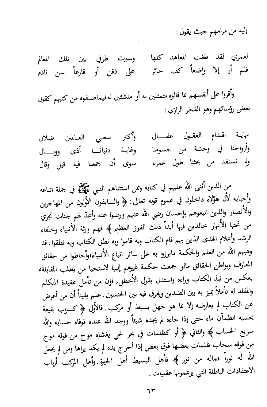 من الذين أثنى الله عليهم في كتابه وممن استثناهم النبي صلى الله عليه وسلم في جملة اتباعه وأحبابه لأن هؤلاء داخلون في عموم قوله تعالى: {وَالسَّابِقُونَ الْأَوَّلُونَ مِنَ الْمُهَاجِرِينَ وَالْأَنْصَارِ وَالَّذِينَ اتَّبَعُوهُمْ بِإِحْسَانٍ رَضِيَ اللَّهُ عَنْهُمْ وَرَضُوا عَنْهُ وَأَعَدَّ لَهُمْ جَنَّاتٍ تَجْرِي تَحْتَهَا الْأَنْهَارُ خَالِدِينَ فِيهَا أَبَداً ذَلِكَ الْفَوْزُ الْعَظِيمُ} فهم ورثة الأنبياء وخلفاء الرشدين وأعلام الهدى الذين بهم قام الكتاب وبه قاموا وبهم نطق الكتاب وبه نطقوا، قد وهبهم الله من العلم والحكمة ما برزوا به على سائر اتباع الأنبياء، وأحاطوا من حقائق المعارف وبواطن الحقائق ما لو جمعت حكمة غيرهم إليها لاستحيا من يطلب المقابلة، بعكس من نبذ الكتاب رراءه واستدل بقول الأخطل، فإن من تأمل عقيدة المتكلم والمقلد له تأملاً يميز به بين الضدين ويفرق فيه بين الجنسين. علم يقيناً أن من أعرض عن الكتاب لم يعارضه إلا بما هو جهل بسيط أو مركب. فالأول {وَالَّذِينَ كَفَرُوا أَعْمَالُهُمْ كَسَرَابٍ بِقِيعَةٍ يَحْسَبُهُ الظَّمْآنُ مَاءً حَتَّى إِذَا جَاءَهُ لَمْ يَجِدْهُ شَيْئاً وَوَجَدَ اللَّهَ عِنْدَهُ فَوَفَّاهُ حِسَابَهُ وَاللَّهُ سَرِيعُ الْحِسَابِ} والثاني {أَوْ كَظُلُمَاتٍ فِي بَحْرٍ لُجِّيٍّ يَغْشَاهُ مَوْجٌ مِنْ فَوْقِهِ مَوْجٌ مِنْ فَوْقِهِ سَحَابٌ ظُلُمَاتٌ بَعْضُهَا فَوْقَ بَعْضٍ إِذَا أَخْرَجَ يَدَهُ لَمْ يَكَدْ يَرَاهَا وَمَنْ لَمْ يَجْعَلِ اللَّهُ لَهُ نُوراً فَمَا لَهُ مِنْ نُورٍ} فأهل البسيط أهل الحيرة. وأهل المركب أرباب الاعتقادات الباطلة التي يزعمونها عقليات.