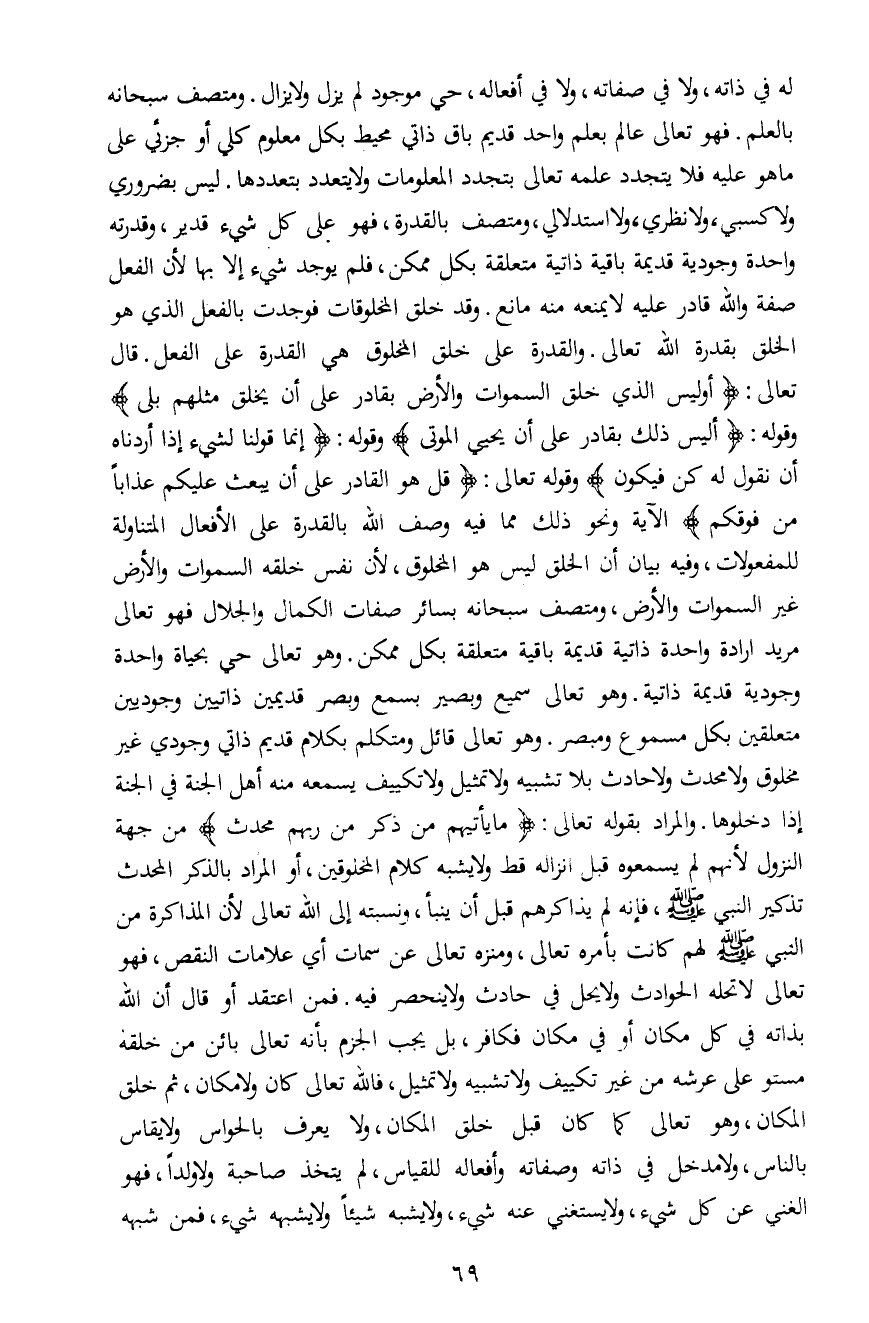 له في ذاته، ولا في صفاته، ولا في أفعاله، حي موجود لم يزل ولا يزال. ومتصف سبحانه بالعلم. فهو تعالى عالم بعلم واحد قديم باق ذاتي محيط بكل معلوم كلي أو جزئي على ما هو عليه فلا يتجدد علمه تعالى بتجدد المعلومات ولا يتعدد بتعددها. ليس بضروري ولا كسبي، ولا نظري، ولا استدلالي، ومتصف بالقدرة، فهو على كل شيء قدير، وقدرته واحدة وجودية قديمة باقية ذاتية متعلقة بكل ممكن، فلم يوجد شيء إلا بها لأن الفعل صفة والله قادر عليه لا يمنعه منه مانع. وقد خلق المخلوقات فوجدت بالفعل الذي هو الخلق بقدرة الله تعالى. والقدرة على خلق المخلوق هي القدرة على الفعل. قال تعالى: {أَوَلَيْسَ الَّذِي خَلَقَ السَّمَاوَاتِ وَالْأَرْضَ بِقَادِرٍ عَلَى أَنْ يَخْلُقَ مِثْلَهُمْ بَلَى} وقوله: {أَلَيْسَ ذَلِكَ بِقَادِرٍ عَلَى أَنْ يُحْيِيَ الْمَوْتَى} وقوله: {إِنَّمَا قَوْلُنَا لِشَيْءٍ إِذَا أَرَدْنَاهُ أَنْ نَقُولَ لَهُ كُنْ فَيَكُونُ} وقوله تعالى: {قُلْ هُوَ الْقَادِرُ عَلَى أَنْ يَبْعَثَ عَلَيْكُمْ عَذَاباً مِنْ فَوْقِكُمْ} الآية ونحو ذلك مما فيه وصف الله بالقدرة على الأفعال المتناولة للمفعولات، وفيه بيان أن الخلق ليس هو المخلوق، لأن نفس خلقه السموات والأرض غير السموات والأرض، ومتصف سبحانه بسائر صفات الكمال والجلال فهو تعالى مريد إرادة واحدة ذاتية قديمة باقية متعلقة بكل ممكن. وهو تعالى حي بحياة واحدة وجودية قديمة ذاتية. وهو تعالى سميع وبصير بسمع وبصر قديمين ذاتيين وجوديين متعلقين بكل مسموع ومبصر. وهو تعالى قائل ومتكلم بكلام قديم ذاتي وجودي غير مخلوق ولا محدث ولا حادث بلا تشبيه ولا تمثيل ولا تكييف يسمعه منه أهل الجنة في الجنة إذا دخلوها. والمراد بقوله تعالى: {مَا يَأْتِيهِمْ مِنْ ذِكْرٍ مِنْ رَبِّهِمْ مُحْدَثٍ} من جهة النزول لأنهم لم يسمعوه قبل إنزاله قط ولا يشبه كلام المخلوقين، أو المراد بالذكر المحدث تذكير النبي صلى الله عليه وسلم، فإنه لم يذاكرهم قبل أن ينبأ، ونسبته إلى الله تعالى لأن المذاكرة من النبي صلى الله عليه وسلم لهم كانت بأمره تعالى، ومنزه تعالى عن سمات أي علامات النقص، فهو تعالى لا تحله الحوادث ولا يحل في حادث ولا ينحصر فيه. فمن اعتقد أو قال أن الله بذاته في كل مكان أو في مكان فكافر، بل يجب الجزم بأنه تعالى بائن من خلقه مستو على عرشه من غير تكييف ولا تشبيه ولا تمثيل، فالله تعالى كان ولا مكان، ثم خلق المكان، وهو تعالى كما كان قبل خلق المكان، ولا يعرف بالحواس ولا يقاس بالناس، ولا مدخل في ذاته وصفاته وأفعاله للقياس، لم يتخذ صاحبة ولا والداً، فهو الغني عن كل شيء، ولا يستغني عنه شيء، ولا يشبه شيئاً ولا يشبهه شيء، فمن شبهه