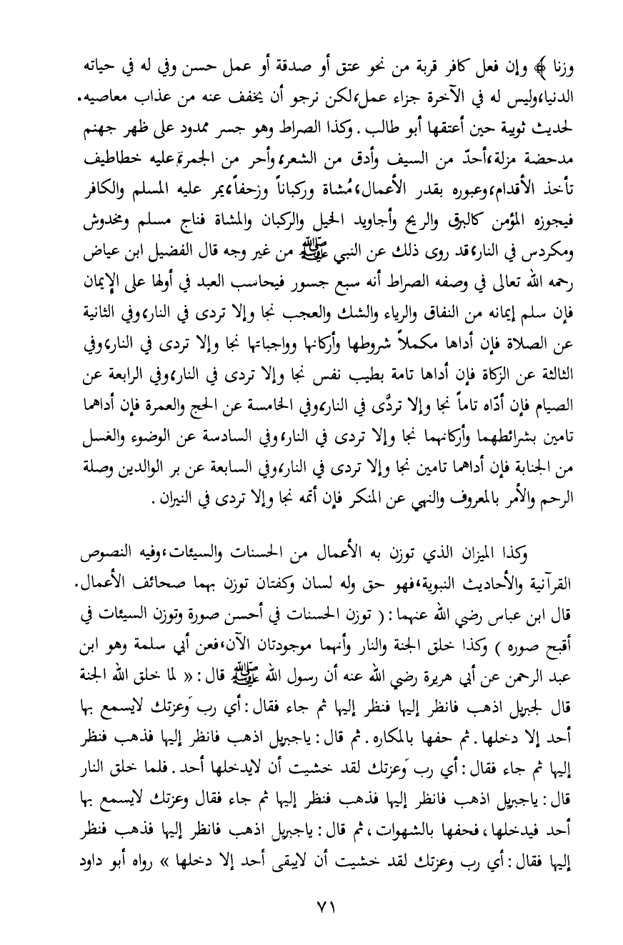 وكذا الميزان الذي توزن به الأعمال من الحسنات والسيئات، وفيه النصوص القرآنية والأحاديث النبوية، فهو حق وله لسان وكفتان توزن بهما صحائف الأعمال. قال ابن عباس رضي الله عنهما: "توزن الحسنات في أحسن صورة وتوزن السيئات في أقبح صوره" وكذا خلق الجنة والنار وأنهما موجودتان الآن، فعن أبي سلمة وهو ابن عبد الرحمن عن أبي هريرة رضي الله عنه أن رسول الله صلى الله عليه وسلم قال: "لما خلق الله الجنة قال لجبريل اذهب فانظر إليها فنظر إليها ثم جاء فقال: أي رب وعزتك لا يسمع بها أحد إلا دخلها. ثم حفها بالمكاره. ثم قال: يا جبريل اذهب فانظر إليها فذهب فنظر إليها ثم جاء فقال: أي رب وعزتك لقد خشيت أن لا يدخلها أحد. فلما خلق النار قال: يا جبريل اذهب فانظر إليها فذهب فنظر إليها ثم جاء فقال وعزتك لا يسمع بها أحد فيدخلها، فحفها بالشهوات، ثم قال: يا جبريل اذهب فانظر إليها فذهب فنظر إليها فقال: أي رب وعزتك لقد خشيت أن لا يبقى أحد إلا دخلها" رواه أبو داود