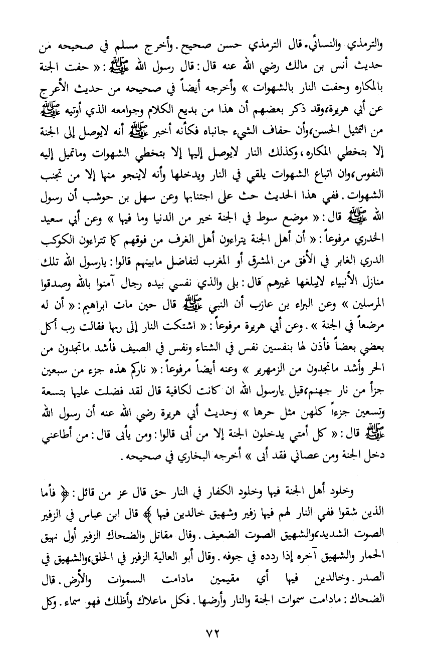 والترمذي والنسائي قال الترمذي حسن صحيح. وأخرج مسلم في صحيحه من حديث أنس بن مالك رضي الله عنه قال: قال رسول الله صلى الله عليه وسلم: "حفت الجنة بالمكاره وحفت النار بالشهوات" وأخرجه أيضاً في صحيحه من حديث الأعرج عن أبي هريرة، وقد ذكر بعضهم أن هذا من بديع الكلام وجوامعه الذي أوتيه صلى الله عليه وسلم من التمثيل الحسن، وأن حفاف الشيء جانباه فكأنه أخبر صلى الله عليه وسلم أنه لا يوصل إلى الجنة إلا بتخطي المكاره، وكذلك النار لا يوصل إليها إلا بتخطي الشهوات وما تميل إليه النفوس، وان إتباع الشهوات يلقى في النار ويدخلها وأنه لا ينجو منها إلا من تجنب الشهوات. ففي هذا الحديث حث على اجتنابها وعن سهل بن حوشب أن رسول الله صلى الله عليه وسلم قال: "موضع سوط في الجنة خير من الدنيا وما فيها" وعن أبي سعيد الخدري مرفوعاً: "أن أهل الجنة يتراءون أهل الغرف من فوقهم كما تتراءون الكوكب الدري الغابر في الأفق من المشرق أو المغرب لتفاضل ما بينهم قالوا: يا رسول الله تلك منازل الأنبياء لا يبلغها غيرهم قال: بلى والذي نفسي بيده رجال آمنوا بالله وصدقوا المرسلين" وعن البراء بن عازب أن النبي صلى الله عليه وسلم قال حين مات إبراهيم: " أن له مرضعاً في الجنة". وعن أبي هريرة مرفوعاً: " اشتكت النار إلى ربها فقالت رب أكل بعضي بعضاً فأذن لها بنفسين نفس في الشتاء ونفس في الصيف فأشد ما تجدون من الحر وأشد ما تجدون من الزمهرير" وعنه أيضاً مرفوعاً: "ناركم هذه جزء من سبعين جزأ من نار جهنم، قيل يا رسول الله ان كانت لكافية قال لقد فضلت عليها بتسعة وتسعين جزءاً كلهن مثل حرها " وحديث أبي هريرة رضي الله عنه أن رسول الله صلى الله عليه وسلم قال: "كل أمتي يدخلون الجنة إلا من أبى قالوا: ومن يأبى قال: من أطاعني دخل الجنة ومن عصاني فقد أبى" أخرجه البخاري في صحيحه.