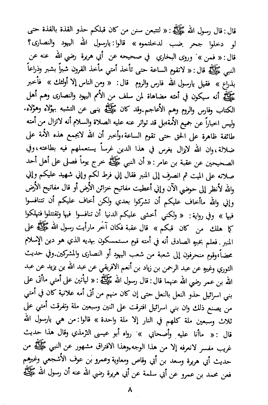 قال: قال رسول الله صلى الله عليه وسلم: "لتتبعن سنن من كان قبلكم حذو القذة بالقذة حتى لو دخلوا جحر ضب لدخلتموه" قالوا: يا رسول الله اليهود والنصارى؟ قال: "فمن". وروى البخاري في صحيحه عن أبي هريرة رضي الله عنه عن النبي صلى الله عليه وسلم قال: "لا تقوم الساعة حتى تأخذ أمتي مأخذ القرون شبراً بشبر وذراعاً بذراع" فقيل يا رسول الله فارس والروم قال: "ومن الناس إلا أولئك" فأخبر صلى الله عليه وسلم أنه سيكون في أمته مضاهاة لمن سلف من الأم اليهود والنصارى وهم أهل الكتاب وفارس والروم وهم الأعاجم. وقد كان صلى الله عليه وسلم ينهي عن التشبه بهؤلاء وهؤلاء. وليس إخباراً عن جميع الأمة، بل قد تواتر عنه عليه الصلاة والسلام أنه لا تزال من أمته طائفة ظاهرة على الحق حتى تقوم الساعة، وأخبر أن الله لا يجمع هذه الأمة على ضلالة، وأن الله لا يزال يغرس في هذا الدين غرساً يستعملهم فيه بطاعته، وفي الصحيحين عن عقبة بن عامر: "أن النبي صلى الله عليه وسلم خرج يوماً فصلى على أهل أحد صلاته على الميت ثم انصرف إلى المنبر فقال إني فرط لكم وإني شهيد عليكم وإني والله لأنظر إلى حوضي الآن وإني أعطيت مفاتيح خزائن الأرض أو قال مفاتيح الأرض وإني والله ما أخاف عليكم أن تشركوا بعدي ولكن أخاف عليكم أن تتنافسوا فيها" رفي رواية: "ولكني أخشى عليكم الدنيا أن تنافسوا فيها وتقتتلوا فتهلكوا كما هلك من كان قبلكم" قال عقبة فكان آخر ما رأيت رسول الله صلى الله عليه وسلم على المنبر. فعلم بخبره الصادق أنه في أمته قوم مستمسكون بهديه الذي هو دين الإسلام محضاً، وقوم منحرفون إلى شعبة من شعب اليهود أو النصارى والمشركين. وفي حديث الثوري وغيره عن عبد الرحمن بن زياد بن أنعم الأفريقي عن عبد الله بن يزيد عن عبد الله بن عمر رضي الله عنهما قال: قال رسول الله صلى الله عليه وسلم: " ليأتين على أمتي ما أتى على بني إسرائيل حذو النعل بالنعل حتى إن كان منهم من أتى أمه علانية كان في أمتي من يصنع ذلك وان بني إسرائيل افترقت على اثنين وسبعين ملة وتفرقت أمتي على ثلاث وسبعين ملة كلهم في النار إلا ملة واحدة" قالوا: من هي يا رسول الله قال: "ما أنا عليه وأصحابي" رواه أبو عيسى الترمذي وقال هذا حديث غريب مفسر لا نعرفه إلا من هذا الوجه، وهذا الافتراق مشهور عن النبي صلى الله عليه وسلم من حديث أبي هريرة وسعد بن أبي وقاص ومعاوية وعمرو بن عوف الأشجعي وغيرهم فعن محمد بن عمرو عن أبي سلمة عن أبي هريرة رضى الله عنه أن رسول الله صلى الله عليه وسلم