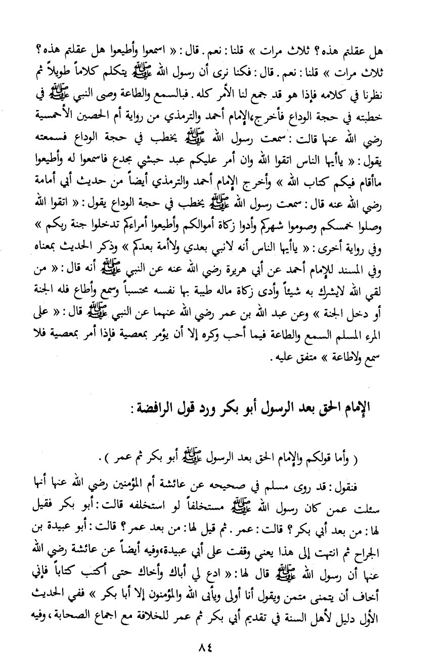 فنقول: قد روى مسلم في صحيحه عن عائشة أم المؤمنين رضي الله عنها أنها سئلت عمن كان رسول الله صلى الله عليه وسلم مستخلفاً لو استخلفه قالت: أبو بكر فقيل لها: من بعد أبي بكر؟ قالت: عمر. ثم قيل لها: من بعد عمر؟ قالت: أبو عبيدة بن الجراح ثم انتهت إلى هذا يعني وقفت على إلى عبيدة، وفيه أيضاً عن عائشة رضي الله عنها أن رسول الله صلى الله عليه وسلم قال لها: "ادع لي أباك وأخاك حتى أكتب كتاباً فإني أخاف أن يتمنى متمن ويقول أنا أولى ويأبى الله والمؤمنون إلا أبا بكر" ففي الحديث الأول دليل لأهل السنة في تقديم أبي بكر ثم عمر للخلافة مع إجماع الصحابة، وفيه