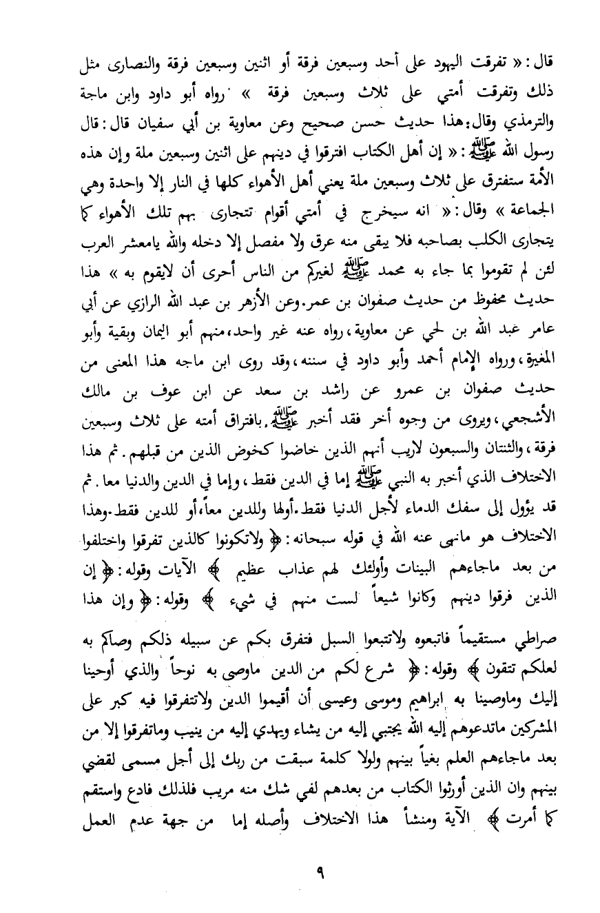 قال: " تفرقت اليهود على أحد وسبعين فرقة أو اثنين وسبعين فرقة والنصارى مثل ذلك وتفرقت أمتي على ثلاث وسبعين فرقة ". رواه أبو داود وابن ماجة والترمذي وقال: هذا حديث حسن صحيح وعن معاوية بن أبي سفيان قال: قال رسول الله صلى الله عليه وسلم: " إن أهل الكتاب افترقوا في دينهم على اثنين وسبعين ملة وإن هذه الأمة ستفترق على ثلاث وسبعين ملة يعني أهل الأهواء كلها في النار إلا واحدة وهي الجماعة " وقال: "أنه سيخرج في أمتي أقوام تتجارى بهم تلك الأهواء كما يتجارى الكلب بصاحبه فلا يبقى منه عرق ولا مفصل إلا دخله والله يا معشر العرب لئن لم تقوموا بما جاء به محمد صلى الله عليه وسلم لغيركم من الناس أحرى أن لا يقوم به" هذا حديث محفوظ من حديث صفوان بن عمر. وعن الأزهر بن عبد الله الرازي عن أبي عامر عبد الله بن لحي عن معاوية، رواه عنه غير واحد، منهم أبو اليمان وبقية وأبو المغيرة، ورواه الإمام أحمد وأبو داود في سننه، وقد روى ابن ماجة هذا المعنى من حديث صفوان بن عمرو عن راشد بن سعد عن ابن عوف بن مالك الأشجعي، ويروى من وجوه أخر فقد أخبر صلى الله عليه وسلم بافتراق أمته على ثلاث وسبعين فرقة، والثنتان والسبعون لا ريب أنهم الذين خاضوا كخوض الذين من قبلهم. ثم هذا الاختلاف الذي أخبر به النبي صلى الله عليه وسلم إما في الدين فقط، وإما في الدين والدنيا معاً، ثم قد يؤول إلى سفك الدماء لأجل الدنيا فقط. أولها وللدين معاً، أو للدين فقط. وهذا الاختلاف هو ما نهى عنه الله في قوله سبحانه: {وَلا تَكُونُوا كَالَّذِينَ تَفَرَّقُوا وَاخْتَلَفُوا مِنْ بَعْدِ مَا جَاءَهُمُ الْبَيِّنَاتُ وَأُولَئِكَ لَهُمْ عَذَابٌ عَظِيمٌ} الآيات وقوله: {إِنَّ الَّذِينَ فَرَّقُوا دِينَهُمْ وَكَانُوا شِيَعاً لَسْتَ مِنْهُمْ فِي شَيْءٍ} وقول: {وَأَنَّ هَذَا صِرَاطِي مُسْتَقِيماً فَاتَّبِعُوهُ وَلا تَتَّبِعُوا السُّبُلَ فَتَفَرَّقَ بِكُمْ عَنْ سَبِيلِهِ ذَلِكُمْ وَصَّاكُمْ بِهِ لَعَلَّكُمْ تَتَّقُونَ} وقوله: {شَرَعَ لَكُمْ مِنَ الدِّينِ مَا وَصَّى بِهِ نُوحاً وَالَّذِي أَوْحَيْنَا إِلَيْكَ وَمَا وَصَّيْنَا بِهِ إِبْرَاهِيمَ وَمُوسَى وَعِيسَى أَنْ أَقِيمُوا الدِّينَ وَلا تَتَفَرَّقُوا فِيهِ كَبُرَ عَلَى الْمُشْرِكِينَ مَا تَدْعُوهُمْ إِلَيْهِ اللَّهُ يَجْتَبِي إِلَيْهِ مَنْ يَشَاءُ وَيَهْدِي إِلَيْهِ مَنْ يُنِيبُ وَمَا تَفَرَّقُوا إِلَّا مِنْ بَعْدِ مَا جَاءَهُمُ الْعِلْمُ بَغْياً بَيْنَهُمْ وَلَوْلا كَلِمَةٌ سَبَقَتْ مِنْ رَبِّكَ إلى أَجَلٍ مُسَمّىً لَقُضِيَ بَيْنَهُمْ وَإِنَّ الَّذِينَ أُورِثُوا الْكِتَابَ مِنْ بَعْدِهِمْ لَفِي شَكٍّ مِنْهُ مُرِيبٍ * فَلِذَلِكَ فَادْعُ وَاسْتَقِمْ كَمَا أُمِرْتَ} الآية ومنشأ هذا الاختلاف وأصله إما من جهة عدم العمل