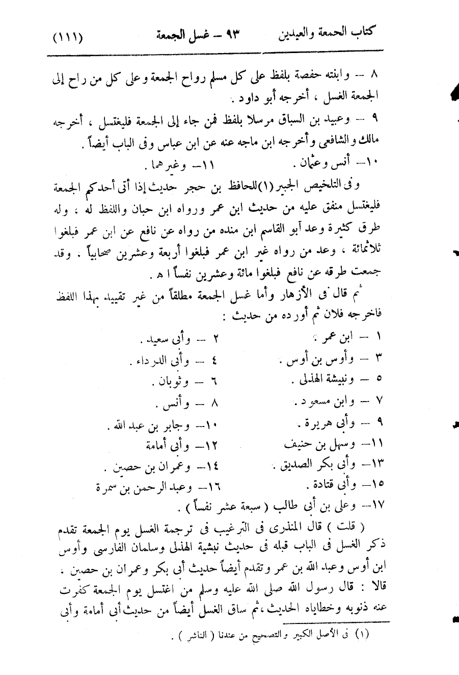 ثم قال في الأزهار وأما غسل الجمعة مطلقاً من غير تقييد بهذا اللفظ فأخرجه فلان ثم أورده من حديث (1) ابن عمر (2) وأبي سعيد (3) وأوس بن أوس (4) وأبي الدرداء (5) ونبيشة الهذلي (6) وثوبان (7) وابن مسعود (8) وأنس (9) وأبي هريرة (10) وجابر بن عبد الله (11) وسهل ابن حنيف (12) وأبي أمامة (13) وأبي بكر الصديق (14) وعمران ابن حصين (15) وأبي قتادة (16) وعبد الرحمان بن سمرة (17) وعلي بن أبي طالب سبعة عشر نفساً.
