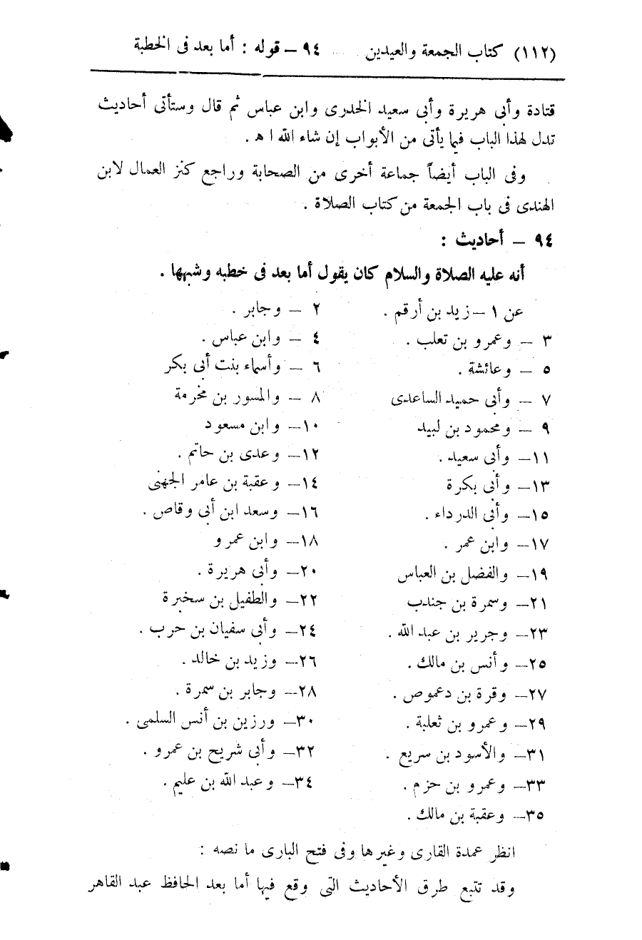 - أنه عليه الصلاة والسلام كان يقول أما بعد في خطبه وشبهها عن (1) زيد بن أرقم (2) وجابر (3) وعمرو بن تغلب (4) وابن عباس (5) وعائشة (6) وأسماء بنت أبي بكر (7) وأبي حميد الساعدي (8) والمسور بن مخرمة (9) ومحمود بن لبيد (10) وابن مسعود (11) وأبي سعيد (12) وعدي بن حاتم (13) وأبي بكرة (14) وعقبة بن عامر الجهني (15) وأبي الدرداء (16) وسعد بن أبي وقاص (17) وابن عمر (18) وابن عمرو (19) والفضل بن العباس (20) وأبي هريرة (21) وسمرة بن جندب (22) والطفيل بن سخبرة (23) وجرير بن عبد الله (24) وأبي سفيان بن حرب (25) وأنس بن مالك (26) وزيد بن خالد (27) وقرة بن دعموص (28) وجابر بن سمرة (26) وعمرو بن ثعلبة (30) ورزين بن أنس السلمي (31) والأسود بن سريع (32) وأبي شريح بن عمرو (33) وعمرو بن حزم (34) وعبد الله بن عليم (35) وعقبة بن مالك انظر عمدة القاري وغيرها وفي فتح الباري ما نصه وقد تتبع طرق الأحاديث التي وقع فيها أما بعد الحافظ عبد القاهر