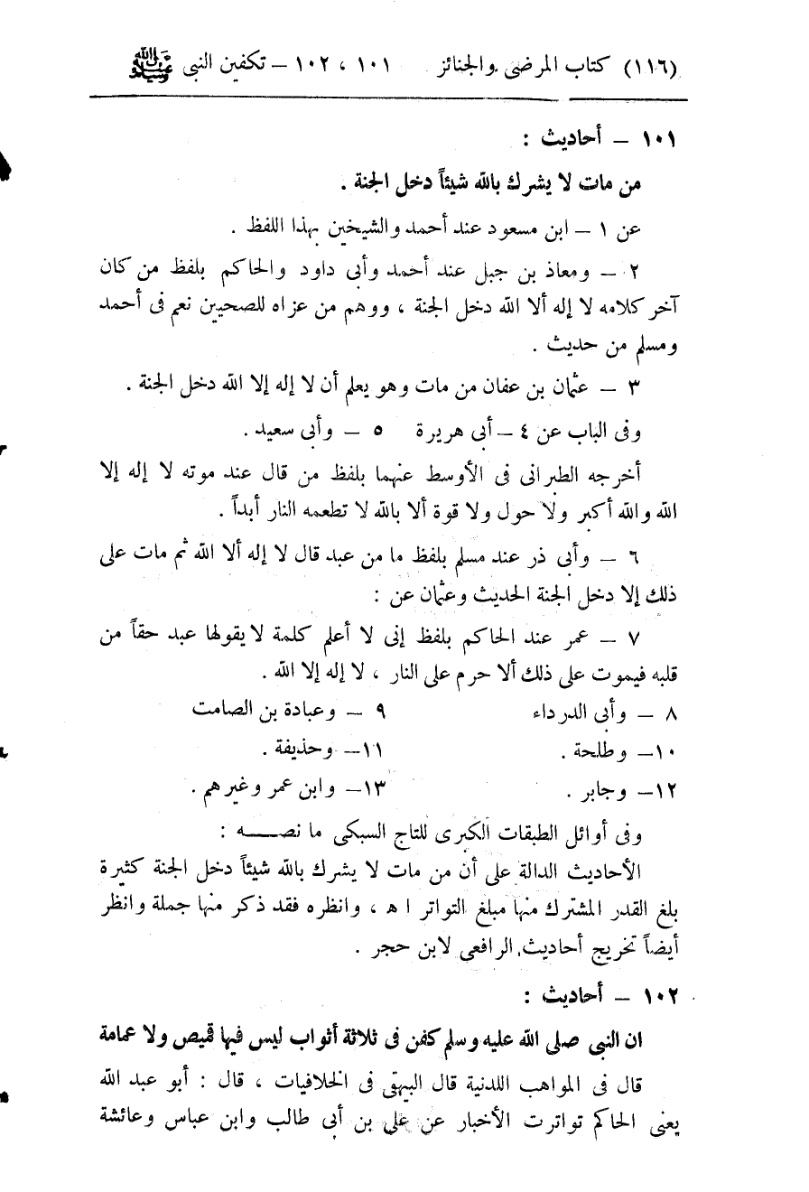 101- (من مات لا يشرك بالله شيئاً دخل الجنة) .