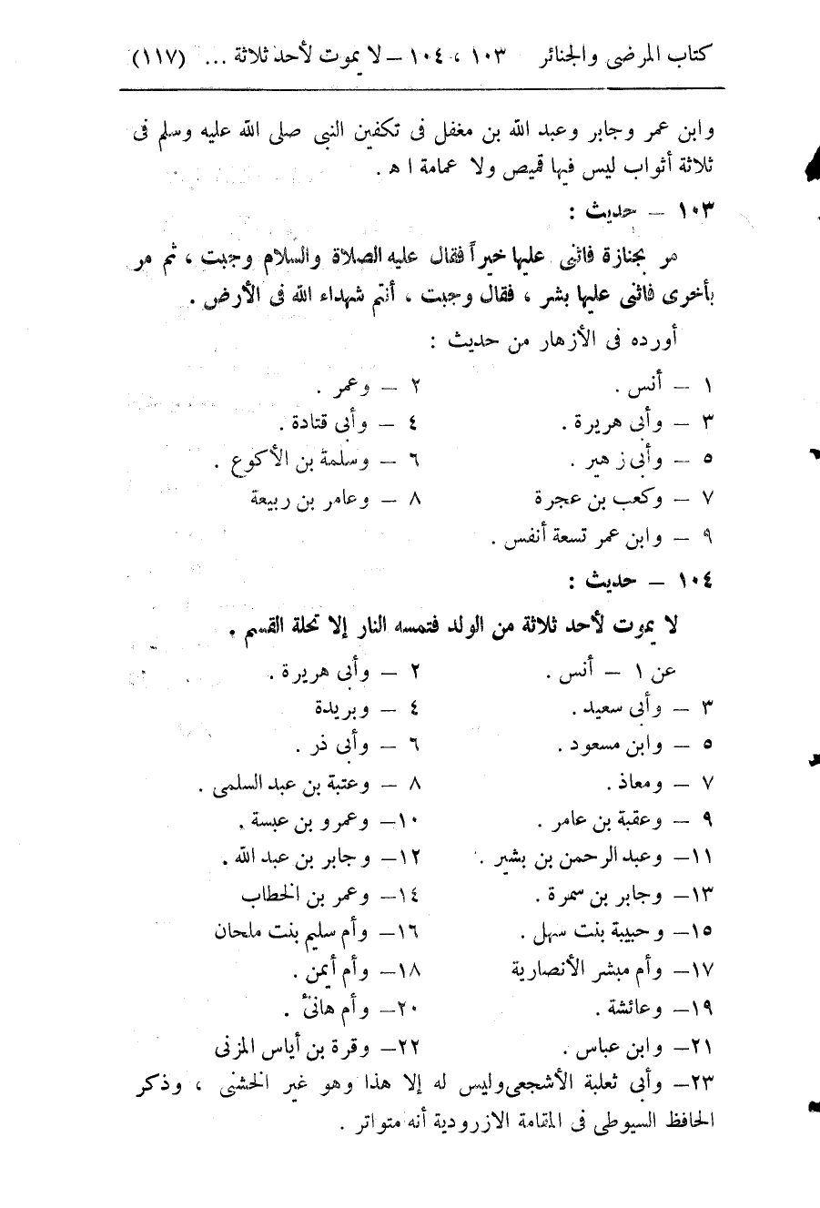 104- (لا يموت لأحد ثلاثة من الولد فتمسه النار إلا تحلة القسم) .