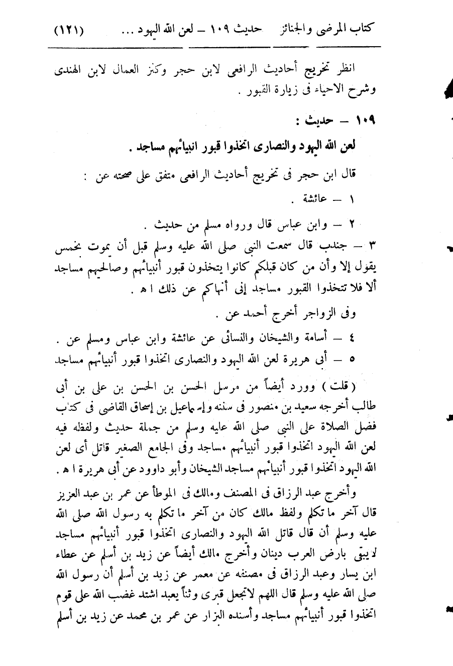109- (لعن الله اليهود والنصارى اتخذوا قبور أنبيائهم مساجد) .