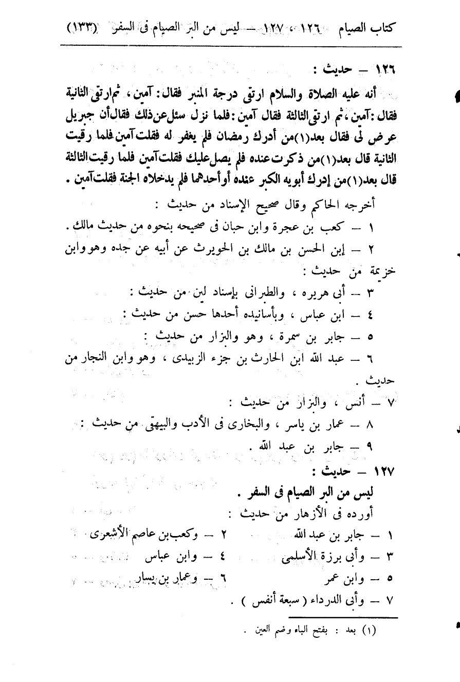 - أورده في الأزهار من حديث (1) جابر بن عبد الله (2) وكعب بن عاصم الأشعري (3) وأبي برزة الأسلمي (4) وابن عباس (5) وابن عمر (6) وعمار بن ياسر (7) وأبي الدرداء سبعة أنفس.