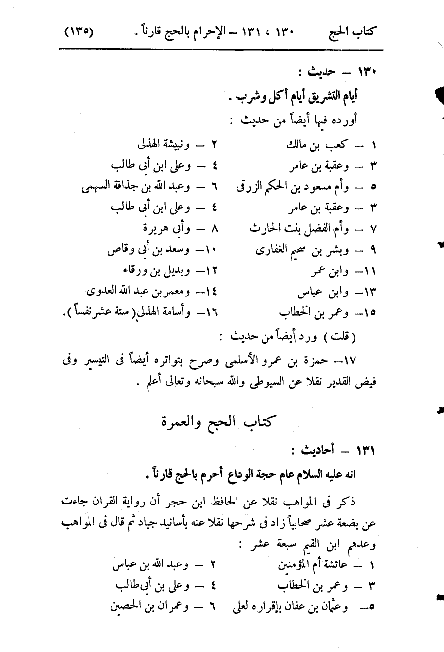 131- (أحاديث القِران: أنه عليه السلام عام حجة الوداع أحرم بالحج قارنا.)