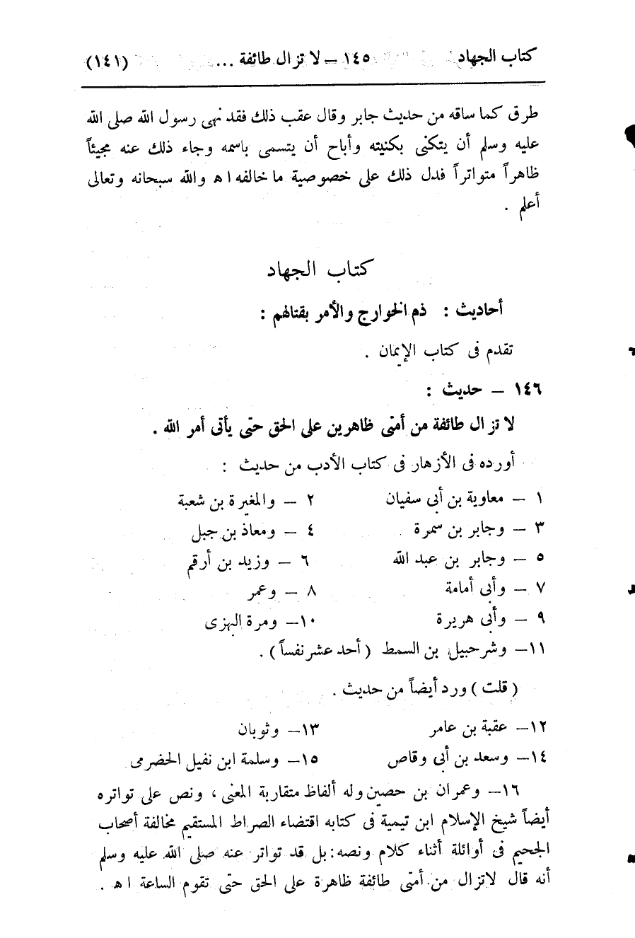 145- (لا تزال طائفة من أمتي ظاهرين على الحق حتى يأتي أمر الله) .
