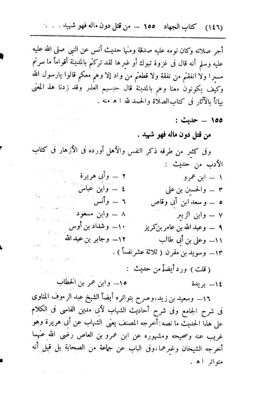 155- (من قتل دون ماله ماله فهو شهيد) .