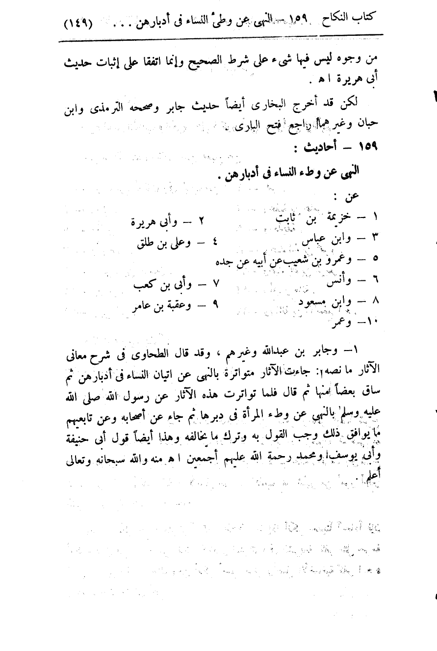 - عن (1) خزيمة بن ثابت (2) وأبي هريرة (3) وابن عباس (4) وعلي بن طلق (5) وعمرو بن شعيب عن أبيه عن جده (6) وأنس (7) وأبي بن كعب (8) وابن مسعود (9) وعقبة بن عامر (10) وعمر (11) وجابر بن عبد الله وغيرهم وقد قال الطحاوي في شرح معاني الآثار ما نصه جاءت الآثار متواترة بالنهي عن إتيان النساء في أدبارهن ثم ساق بعضاً منها ثم قال فلما تواترت هذه الآثار عن رسول الله صلى الله عليه وسلم بالنهي عن وطء المرأة في دبرها ثم جاء عن أصحابه وعن تابعيهم ما يوافق ذلك وجب القول به وترك ما يخالفه وهذا أيضاً قول أبي حنيفة وأبي يوسف ومحمد رحمة الله عليهم أجمعين اهـ منه والله سبحانه وتعالى أعلم.