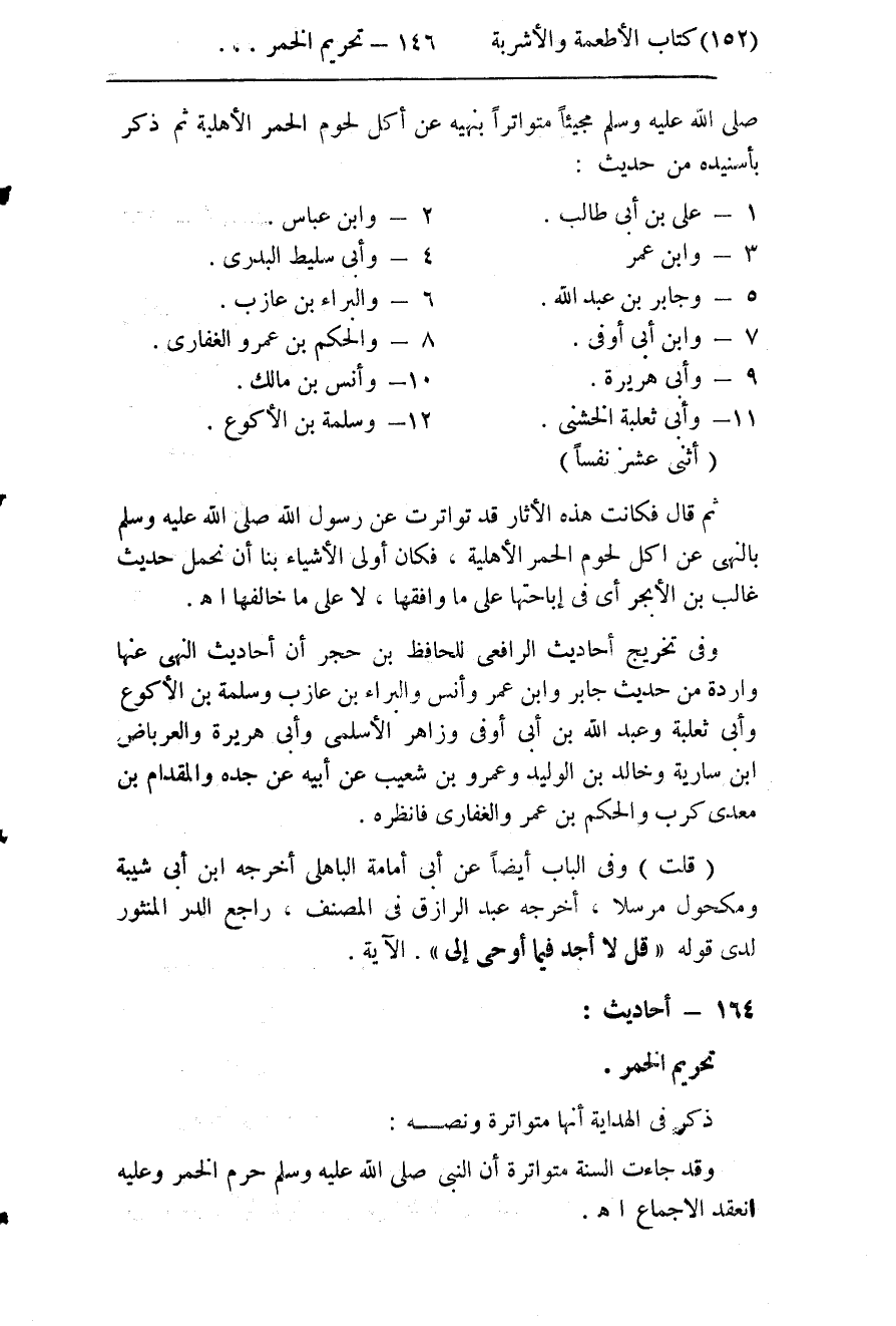 مجيئاً متواتراً بنهيه عن أكل لحوم الحمر الأهلية ثم ذكرها بأسانيده من حديث (1) علي ابن أبي طالب (2) وابن عباس (3) وابن عمر (4) وأبي سليط البدري (5) وجابر بن عبد الله (6) والبراء بن عازب (7) وابن أبي أوفى (8) والحكم بن عمرو الغفاري (9) وأبي هريرة (10) وأنس بن مالك (11) وأبي ثعلبة الخشني (12) وسلمة بن الأكوع اثني عشر نفساً ثم قال فكانت هذه الآثار قد تواترت عن رسول الله صلى الله عليه وسلم بالنهي عن أكل لحوم الحمر الأهلية فكان أولى الأشياء بنا أن نحمل حديث غالب بن الأبجر أي في إباحتها على ما وافقها لا على ما خالفها اهـ وفي تخريج أحاديث الرافعي للحافظ ابن حجر أن أحاديث النهي عنها واردة من حديث جابر وابن عمر وابن عباس وأنس والبراء بن عازب وسلمة بن الأكوع وأبي ثعلبة وعبد الله بن أبي أوفى وزاهر الأسلمي وأبي هريرة والعرباض ابن سارية وخالد بن الوليد وعمرو بن شعيب عن أبيه عن جده والمقدام بن معدى كرب والحكم ابن عمرو الغفاري فانظره.