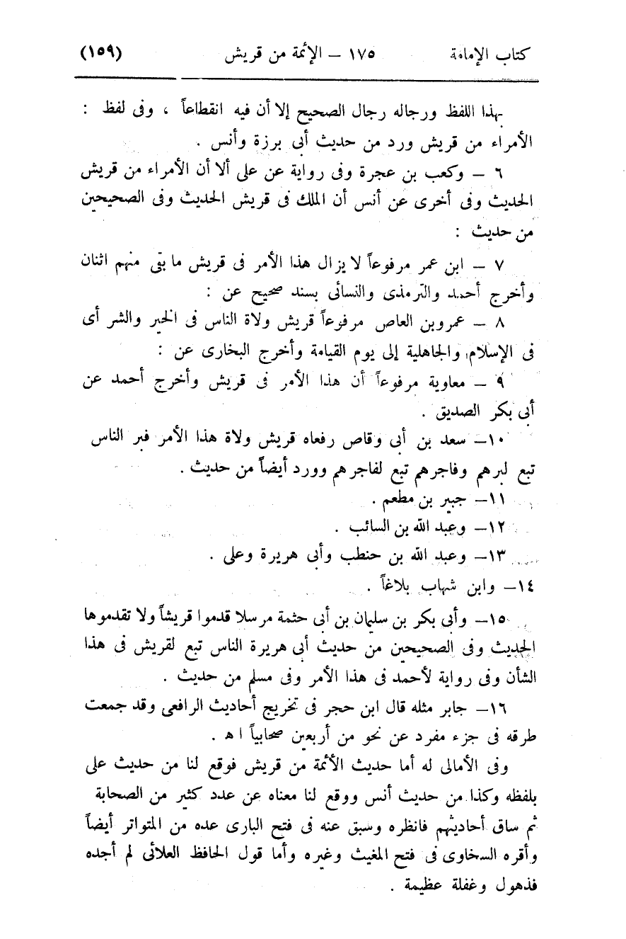 بهذا اللفظ ورجاله رجال الصحيح إلا أن فيه انقطاعاً وفي لفظ الأمراء من قريش ورد من حديث أبي برزة وأنس (6) وكعب بن عجرة وفي رواية عن علي ألا إن الأمراء من قريش الحديث وفي أخرى عن أنس أن الملك في قريش الحديث وفي الصحيحين من حديث (7) ابن عمر مرفوعاً لا يزال هذا الأمر في قريش ما بقي منهم اثنان وأخرج أحمد والترمذي والنسائي بسند صحيح عن (8) عمرو بن العاص مرفوعاً قريش ولاة الناس في الخير والشر أي في الإسلام والجاهلية إلى يوم القيامة وأخرج البخاري عن (9) معاوية مرفوعاً أن هذا الأمر في قريش وأخرج أحمد عن أبي بكر الصديق وسعد بن (10) أبي وقاص رفعاه قريش ولاة هذا الأمر فبر الناس تبع لبرهم وفاجرهم تبع لفاجرهم وورد أيضاً من حديث (11) جبير بن مطعم (12) وعبد الله بن السائب (13) وعبد الله بن حنطب وأبي هريرة وعلي (14) وابن شهاب بلاغاً (15) وأبي بكر بن سليمان بن أبي حثمة مرسلاً قدموا قريشاً ولا تقدموها الحديبث وفي الصحيحين من حديث أبي هريرة الناس تبع لقريش في هذا الشأن وفي رواية لأحمد في هذا الأمر وفي مسلم من حديث (16) جابر مثله قال ابن حجر في تخريج أحاديث الرافعي وقد جمعت طرقه في جزء مفرد عن نحو من أربعين صحابياً اهـ.