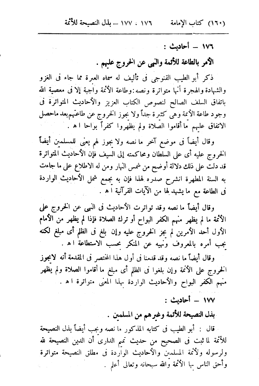 - ذكر أبو الطيب القنوجي في تأليف له سماه العبرة مما جاء في الغزو والشهادة والهجرة أنها متواترة ونصه وطاعة الأئمة واجبة إلا في معصية الله باتفاق السلف الصالح لنصوص الكتاب العزيز والأحاديث المتواترة في وجوب طاعة الأئمة وهي كثيرة جداً ولا يجوز الخروج عن طاعتهم بعد ما حصل الاتفاق عليهم ما أقاموا الصلاة ولم يظهروا كفراً بواحاً اهـ.