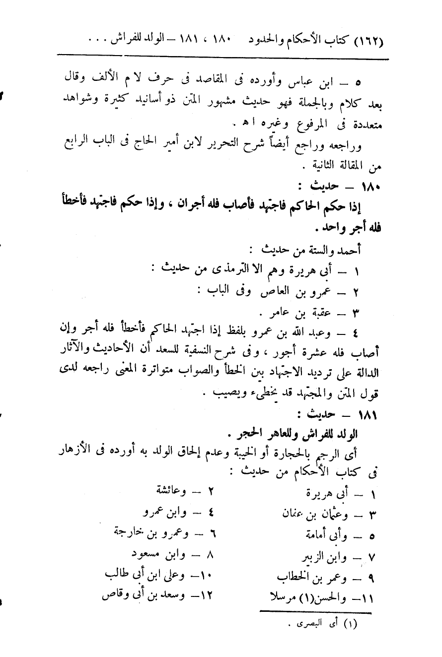 180- (إذا حكم الحاكم فاجتهد فأصاب فله أجران وإذا حكم فاجتهد فأخطأ فله أجر واحد) .