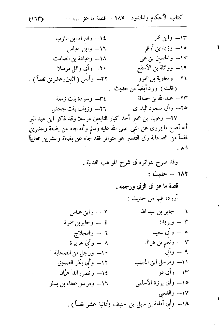 - أورده فيها من حديث (1) جابر بن عبد الله (2) وابن عباس (3) وبريدة (4) وجابر بن سمرة (5) وأبي سعيد (6) واللجلاج (7) ونعيم بن هزال (8) وأبي هريرة (9) وأبي (10) ورجل من الصحابة (11) ومرسل ابن المسيب (12) وأبي بكر الصديق (13) وأبي ذر (14) ونصر والد عثمان (15) وأبي برزة الأسلمي (16) ومرسل عطاء بن يسار (17) والشعبي (18) وأبي أمامة بن سهل بن حنيف ثمانية عشر نفساً.