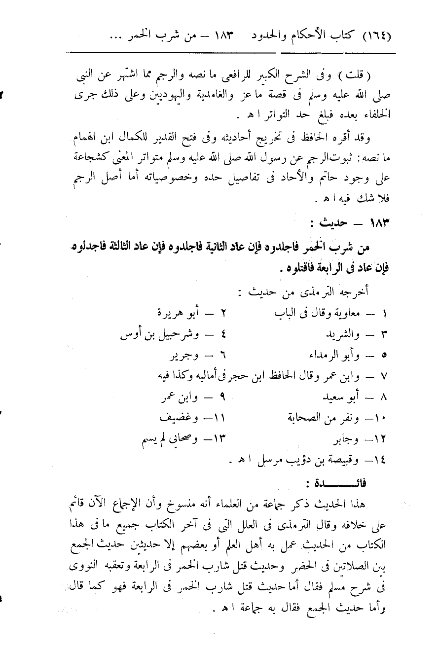 183- (من شرب الخمر فاجلدوه فإن عاد الثانية فاجلدوه فإن عاد الثالثة فاجلدوه فإن عاد الرابعة فاقتلوه) .