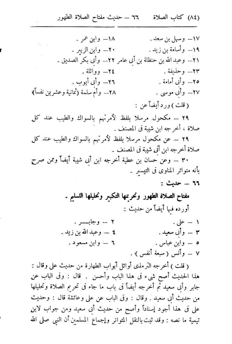 66- (مفتاح الصلاة الطهور وتحريمها التكبير وتحليلها التسليم) .