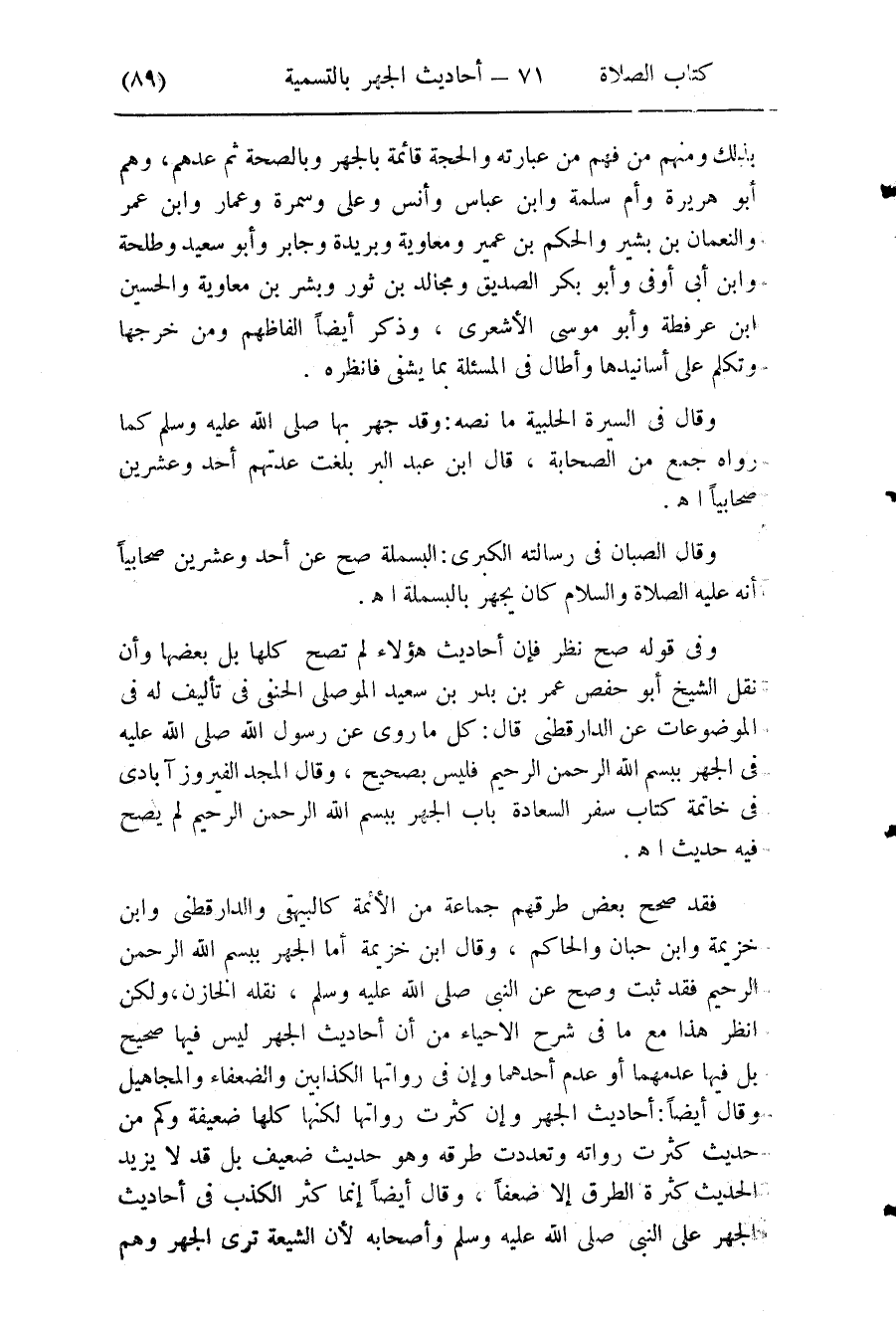 وقال الصبان في رسالته الكبرى في البسملة صح عن أحد وعشرين صحابياً أنه عليه الصلاة والسلام كان يجهر بالبسملة اهـ وفي قوله صح نظر فإن أحاديث هؤلاء لم تصح كلها بل بعضها وإن نقل الشيخ أبو حفص عمر بن بدر ابن سعيد الموصلي الحنفي في تأليف له في الموضوعات عن الدارقطني قال كل ما روي عن رسول الله صلى الله عليه وسلم في الجهر ببسم الله الرحمان الرحيم فليس بصحيح وقال المجد الفيروز أبا ذي في خاتمة كتاب سفر السعادة باب الجهر ببسم الله الرحمان الرحيم لم يصح فيه حديث اهـ.