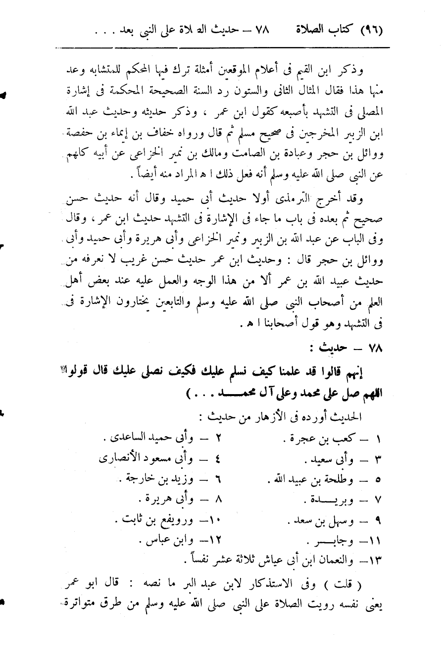 - أنهم قالوا قد علمنا كيف نسلم عليك فكيف نصلي عليك قال قولوا اللهم صل على محمد وعلى آل محمد الحديث أورده في الأزهار من حديث (1) كعب بن عجرة (2) وأبي حميد الساعدي (3) وأبي سعيد (4) وأبي مسعود الأنصاري (5) وطلحة بن عبيد الله (6) وزيد بن خارجة (7) وبريدة (8) وأبي هريرة (9) وسهل بن سعد (10) ورويفع بن ثابت (11) وجابر (12) وابن عباس (13) والنعمان ابن أبي عياش ثلاثة عشر نفساً.
