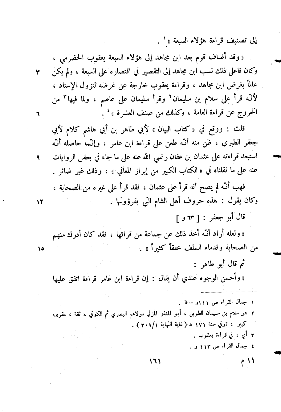 "وقد أضاف قوم بعد ابن مجاهد إلى هؤلاء السبعة يعقوب الحضرمي، وكان فاعل ذلك نسب ابن مجاهد إلى التقصير في اقتصاره على السبعة، ولم يكن عالمًا بغرض ابن مجاهد، وقراءة يعقوب خارجة عن غرضه لنزول الإسناد؛ لأنه قرأ على سلام بن سليمان (¬2) وقرأ سليمان على عاصم، ولما فيها (¬3) من الخروج عن قراءة العامة، وكذلك من صنف العشرة" (¬4) .