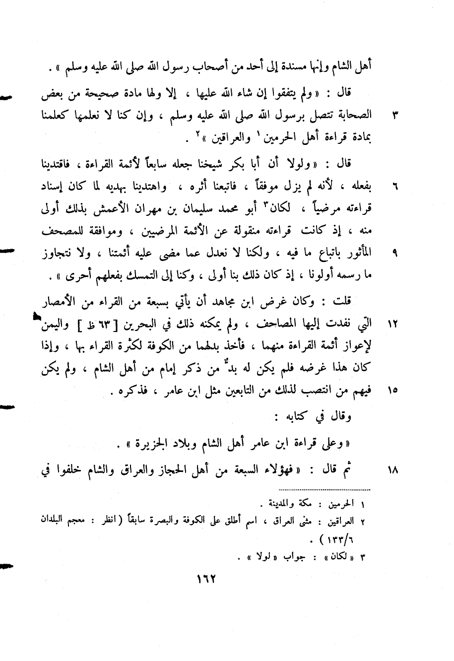 قلت: وكان غرض ابن مجاهد أن يأتي بسبعة من القراء من الأمصار التي نفدت إليها المصاحف، ولم يمكنه ذلك في البحرين [63 ظ] واليمن لإعواز أئمة القراءة منهما، فأخذ بدلهما من الكوفة لكثرة القراء بها، وإذا كان هذا غرضه فلم يكن له بد من ذكر إمام من أهل الشام، ولم يكن فيهم من انتصب لذلك من التابعين مثل ابن عامر، فذكره.