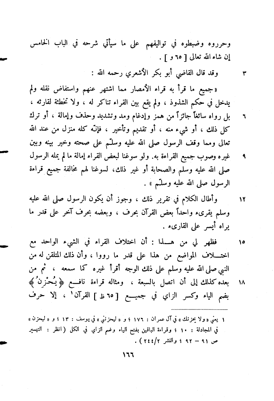 فظهر لي من هذا: أن اختلاف القراء في الشيء الواحد مع اختلاف المواضع من هذا على قدر ما رووا، وأن ذلك المتلقن له من النبي صَلَّى اللَّهُ عَلَيْهِ وَسَلَّمَ على ذلك الوجه أقرأ غيره كما سمعه، ثم من بعده كذلك إلى أن اتصل بالسبعة، ومثاله قراءة نافع "يُحْزِنُ" بضم الياء وكسر الزاي في جميع [65 ظ] القرآن (¬1) ، إلا حرف