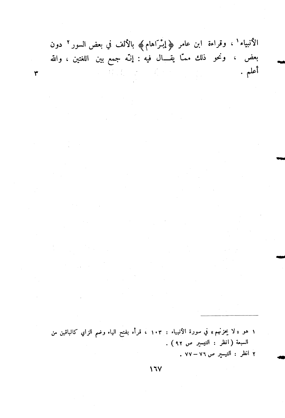 الأنبياء (¬1) ، وقراءة ابن عامر "إبراهام" بالألف في بعض السور (¬2) دون بعض، ونحو ذلك مما يقال فيه: إنه جمع بين اللغتين، والله أعلم.