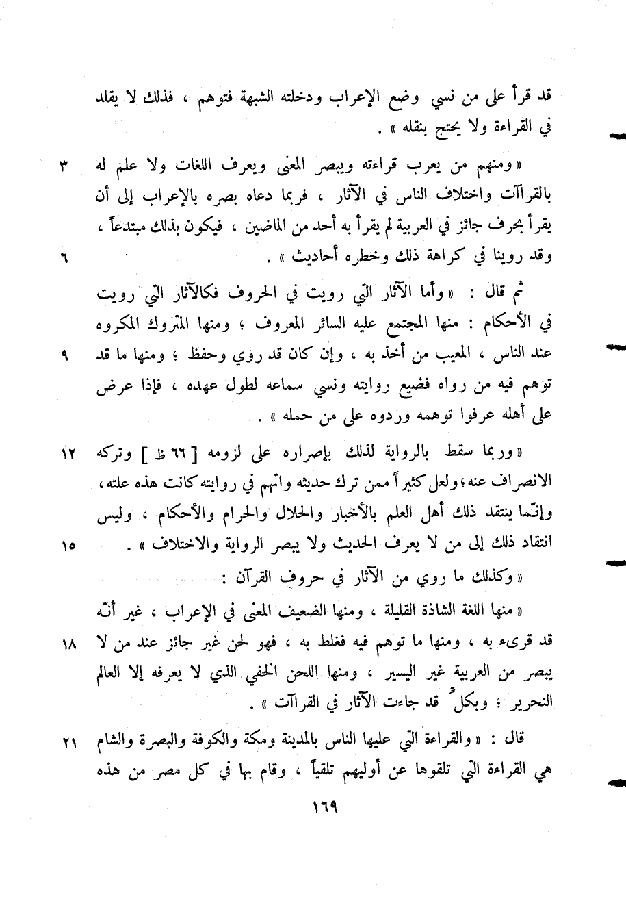 "ومنهم من يعرب قراءته ويبصر المعنى ويعرف اللغات ولا علم له بالقراءات واختلاف الناس في الآثار، فربما دعاه بصره بالإعراب إلى أن يقرأ بحرف جائز في العربية لم يقرأ به أحد من الماضين، فيكون بذلك مبتدعا، وقد روينا في كراهة ذلك وخطره أحاديث".