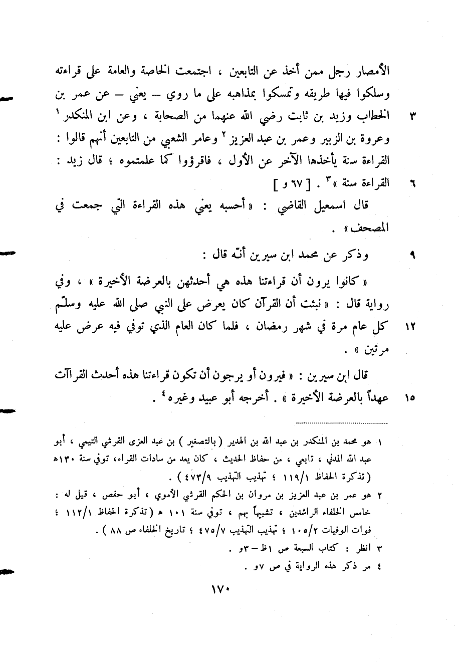 الأمصار رجل ممن أخذ عن التابعين، اجتمعت الخاصة والعامة على قراءته وسلكوا فيها طريقه وتمسكوا بمذاهبه على ما روي -يعني- عن عمر بن الخطاب وزيد بن ثابت رضي الله عنهما من الصحابة، وعن ابن المنكدر (¬1) وعروة بن الزبير وعمر بن عبد العزيز (¬2) وعامر الشعبي من التابعين أنهم قالوا: القراءة سنة يأخذها الآخر عن الأول، فاقرءوا كما علمتموه، قال زيد: القراءة سنة" (¬3) . [67 و] .