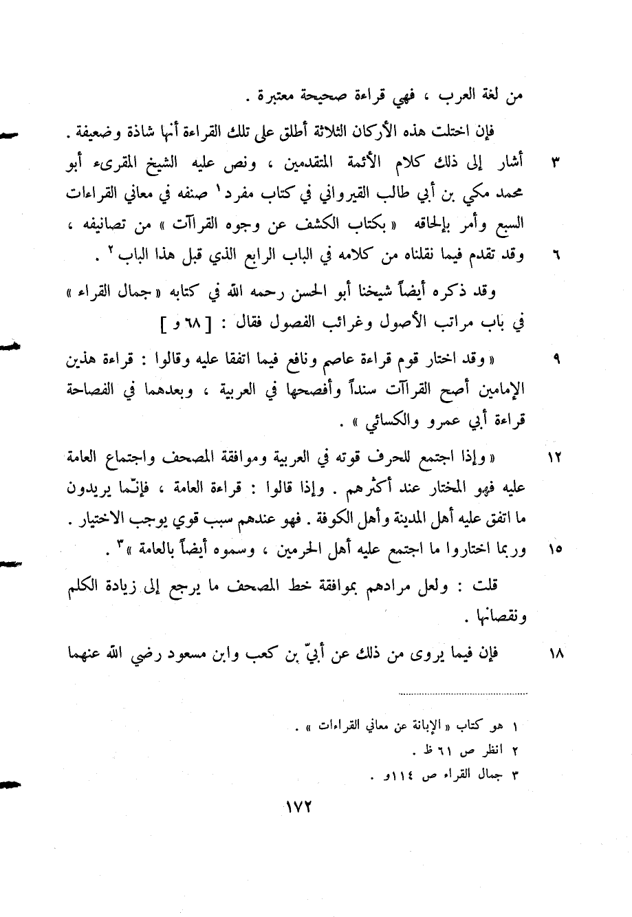 "وإذا اجتمع للحرف قوته في العربية وموافقة المصحف واجتماع العامة عليه فهو المختار عند أكثرهم. وإذا قالوا: قراءة العامة، فإنما يريدون ما اتفق عليه أهل المدينة وأهل الكوفة. فهو عندهم سبب قوي يوجب الاختيار. وربما اختاروا ما اجتمع عليه أهل الحرمين، وسموه أيضا بالعامة" (¬3) .