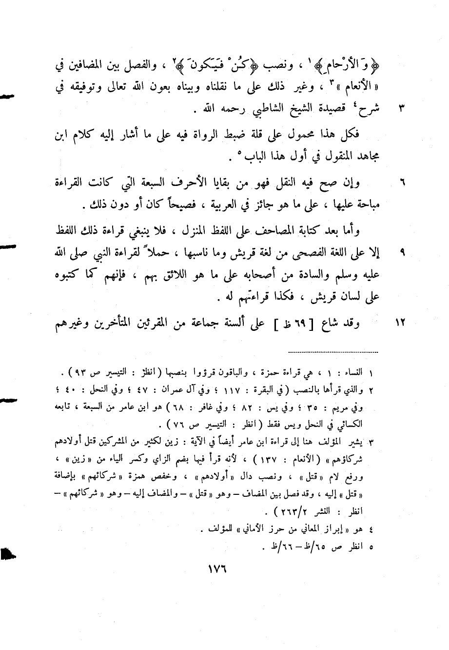 "والأرحامِ" (¬1) ، ونصب "كن فيكونَ" (¬2) ، والفصل بين المضافين في "الأنعام" (¬3) ، وغير ذلك على ما نقلناه وبيناه بعون الله تعالى وتوفيقه في شرح (¬4) قصيدة الشيخ الشاطبي رحمه الله.