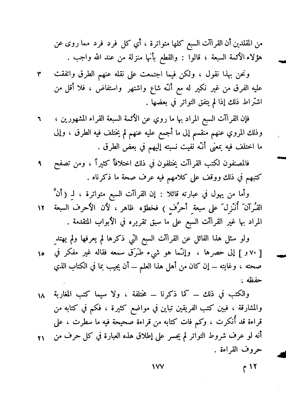 ولو سئل هذا القائل عن القراءات السبع التي ذكرها لم يعرفها ولم يهتد [70 و] إلى حصرها، وإنما هي شيء طرق سمعه فقاله غير مفكر في صحته، وغايته -إن كان من أهل هذا العلم- أن يجيب بما في الكتاب الذي حفظه.