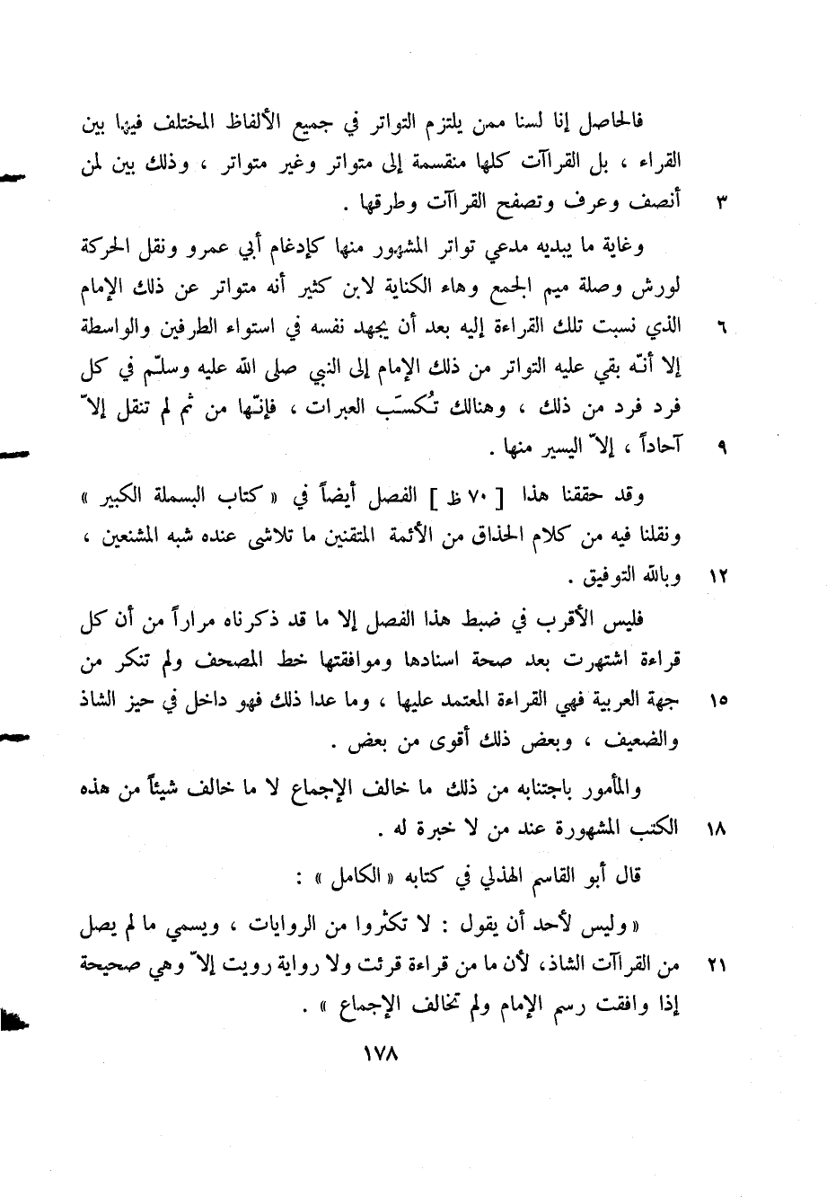 "وليس لأحد أن يقول: لا تكثروا من الروايات، ويسمي ما لم يصل من القراءات الشاذ؛ لأن ما من قراءة قرئت ولا رواية رويت إلا وهي صحيحة إذا وافقت رسم الإمام ولم تخالف الإجماع".