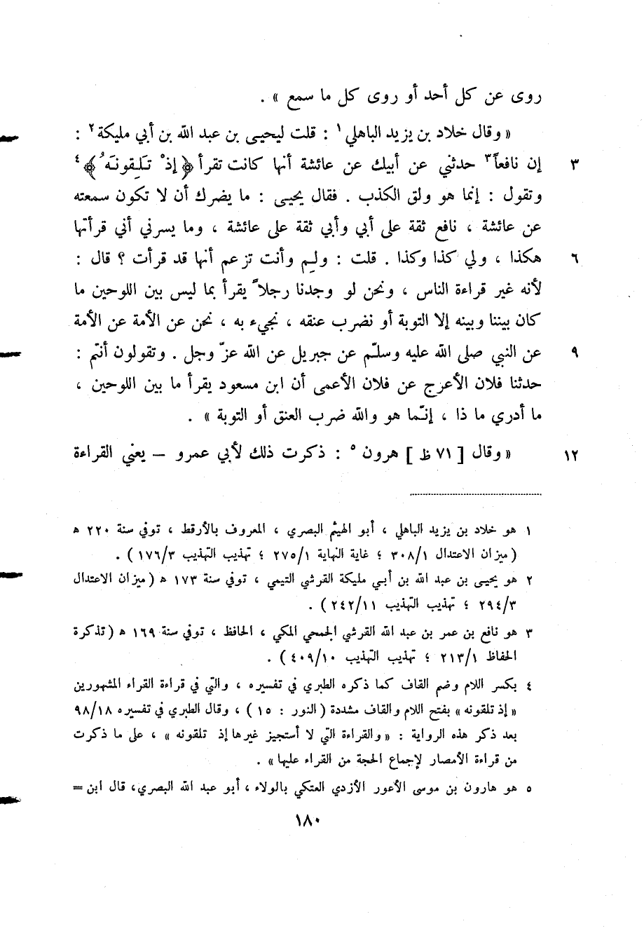"وقال خلاد بن يزيد الباهلي (¬1) : قلت ليحيى بن عبد الله بن أبي مليكة (¬2) : إن نافعا (¬3) حدثني عن أبيك عن عائشة أنها كانت تقرأ "إذ تَلِقونه" (¬4) وتقول: إنما هو ولق الكذب. فقال يحيى: ما يضرك أن لا تكون سمعته عن عائشة، نافع ثقة على أبي وأبي ثقة على عائشة، وما يسرني أني قرأتها هكذا، ولي كذا وكذا. قلت: ولم وأنت تزعم أنها قد قُرئت؟ قال: لأنه غير قراءة الناس، ونحن لو وجدنا رجلا يقرأ بما ليس بين اللوحين ما كان بيننا وبينه إلا التوبة أو نضرب عنقه، نجيء به، نحن عن الأمة عن الأمة عن النبي صَلَّى اللَّهُ عَلَيْهِ وَسَلَّمَ عن جبري عن الله عز وجل. وتقولون أنتم: حدثنا فلان الأعرج عن فلان الأعمى أن ابن مسعود يقرأ ما بين اللوحين، ما أدري ماذا، إنما هو والله ضرب العنق أو التوبة".